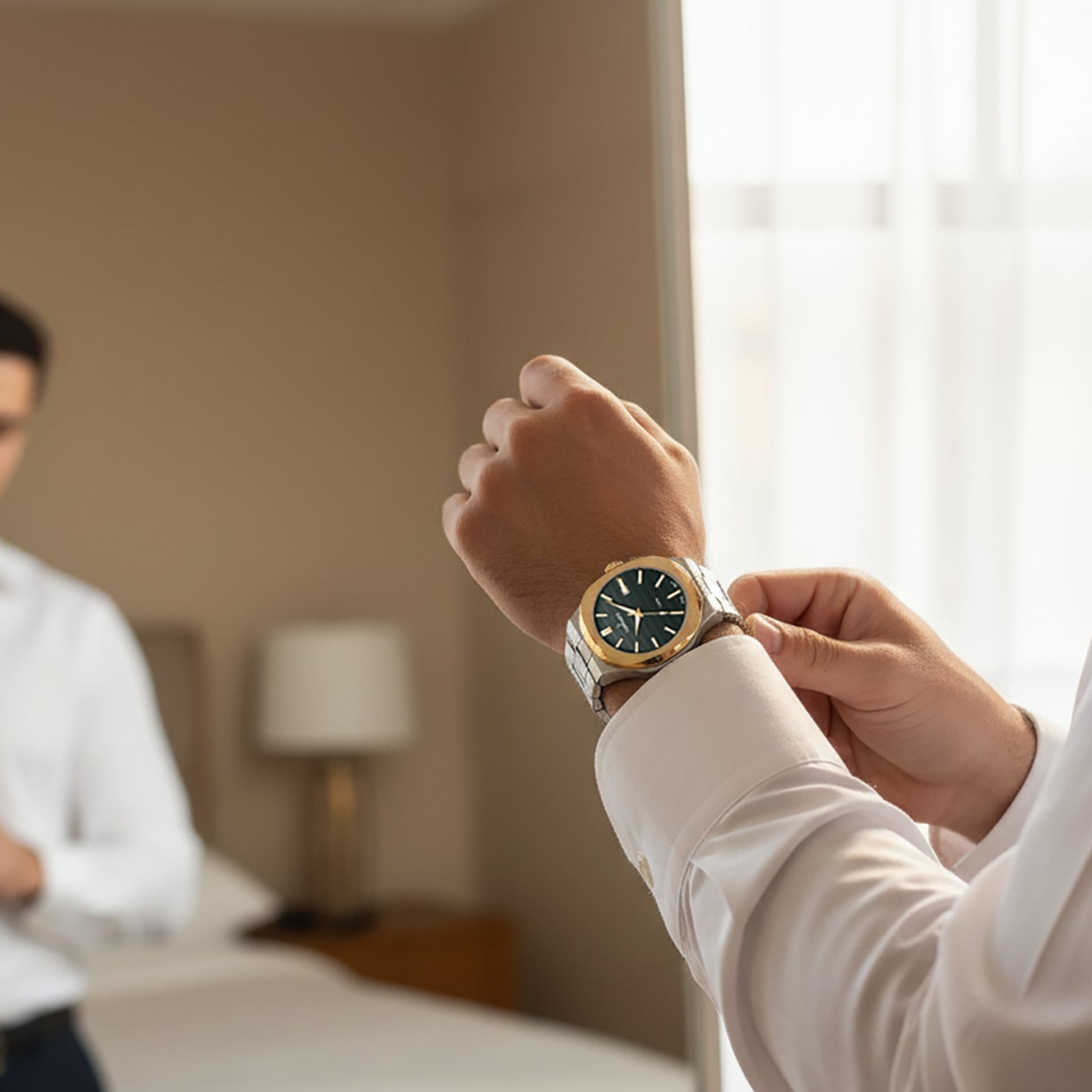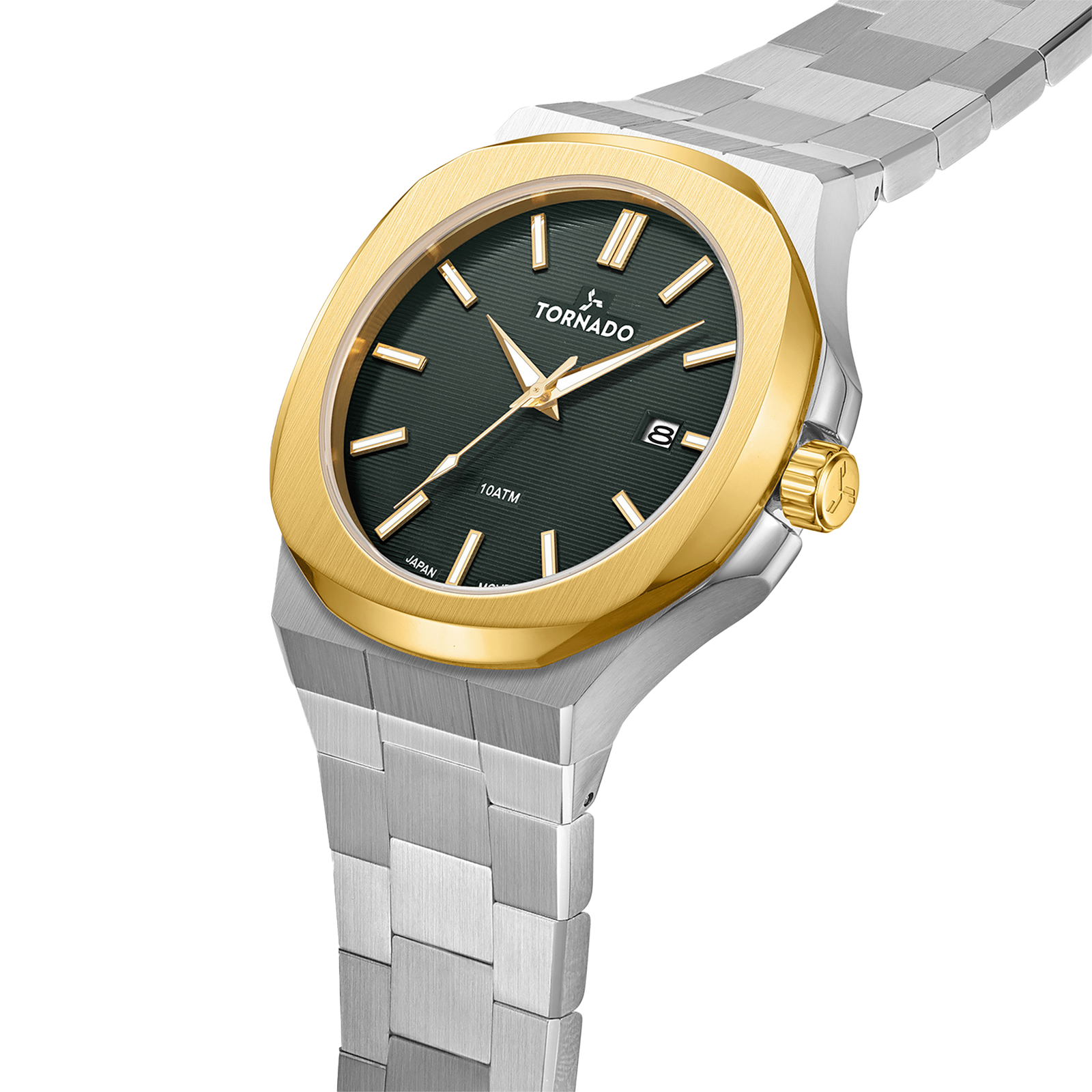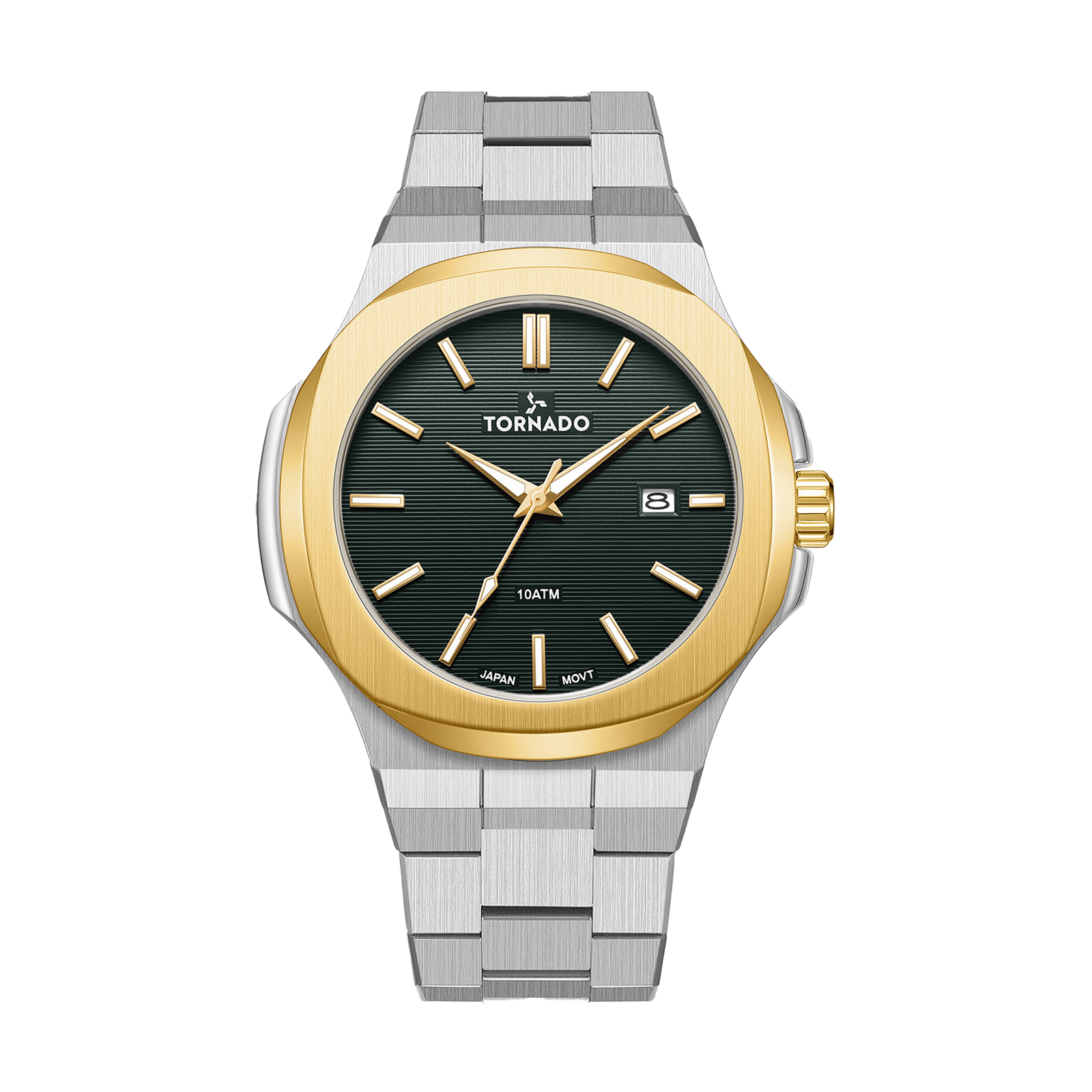 AURORA EON Bold and contemporary men?s analog watch featuring a green textured dial with luminous hands and markers. Crafted with a 316L solid stainless-steel two-tone case and octagonal bezel, powered by Miyota 2315 quartz movement. Sapphire-coated glass and 10 ATM water resistance ensure durability and everyday reliability.
