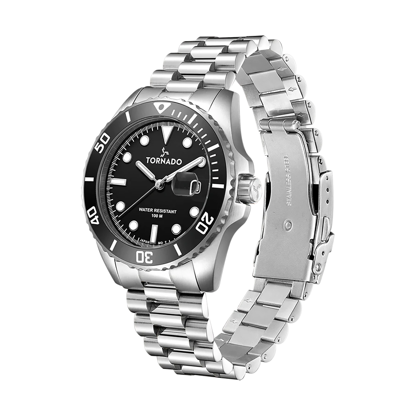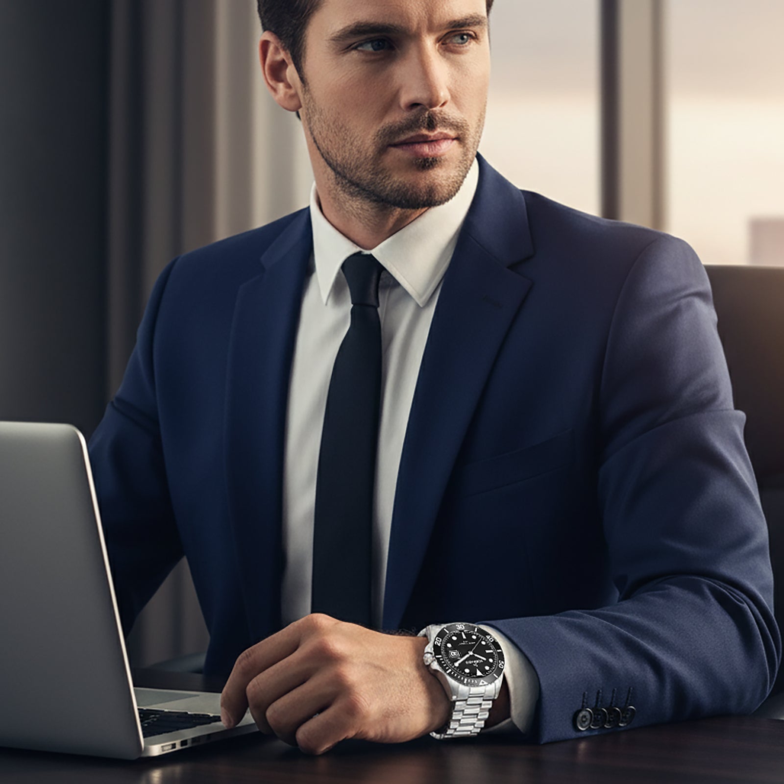 Clean, purpose-built design with everyday durability. Understated power with daily polish, this men?s dive-style watch pairs a 316L stainless-steel case and ceramic unidirectional bezel with a sapphire-coated crystal and magnified date for crisp legibility, while luminous markers keep the black dial readable from boardroom to redeye. The star is the polished solid stainless-steel presidential bracelet?broader, weightier links with a smooth drape and push-button deployant that sit like jewelry yet wear like equipment. Inside, precise Japanese Miyota 2115 quartz delivers set-and-forget accuracy; outside, 10 ATM water resistance handles weather and short swims. It?s the monochrome classic that fits all wardrobes?tailored suits, dark denim, leather jackets?with the right mix of durability and luxury. If you want a men?s stainless-steel watch that feels premium in the hand and on the wrist, this is the one.