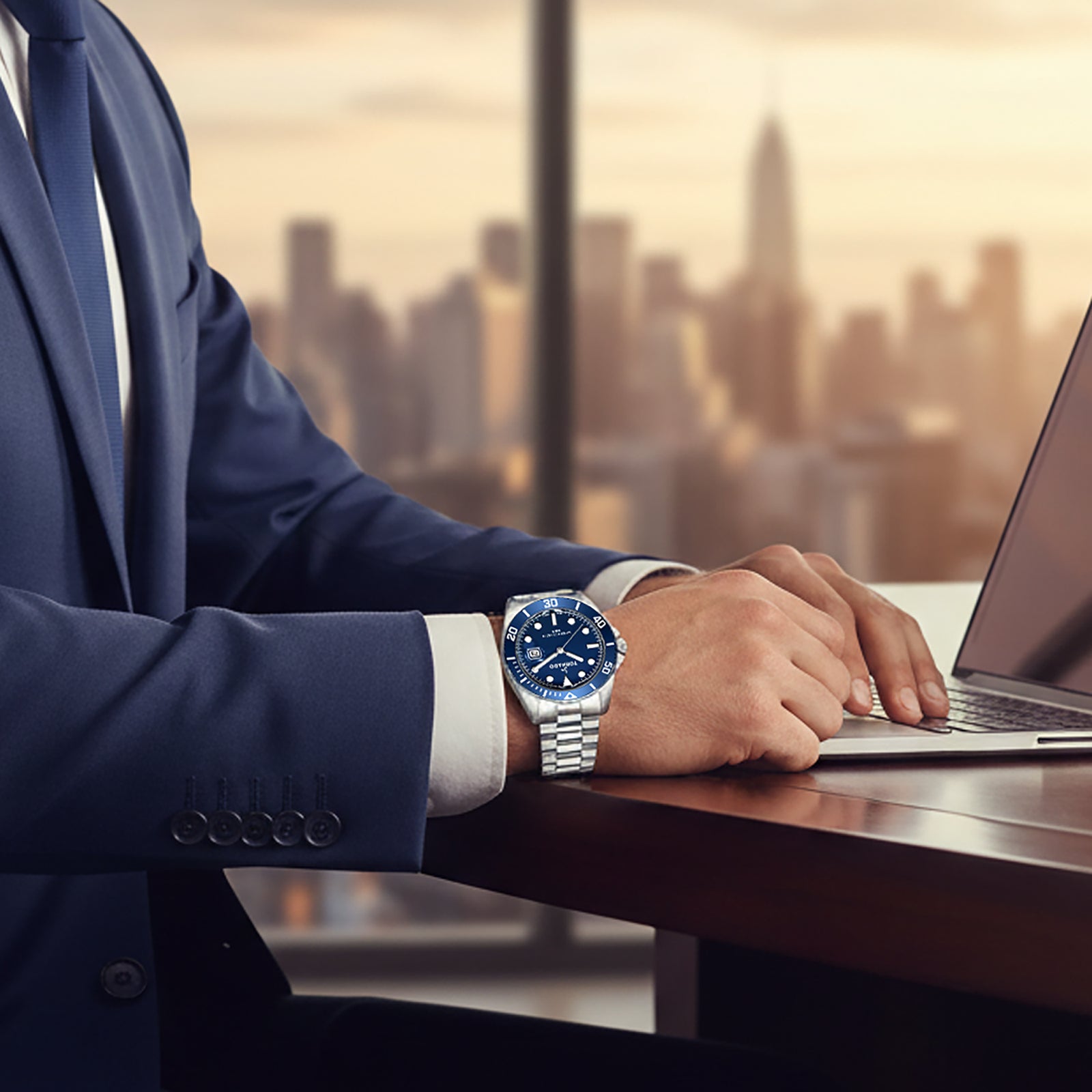 An all-time blue classic. A definitive blue dive-style watch with serious daily polish: the 316L stainless-steel case and ceramic unidirectional bezel frame a deep blue dial under a sapphire-coated crystal with a magnified date, while high-lume markers keep time legible from office lighting to waterfront nights. The polished solid stainless-steel presidential bracelet is the standout?broad, weighty links with a smooth drape and mirror-finished centers against brushed outers, secured by a push-button deployant for a clean, tailored fit that wears like fine jewelry yet performs like gear. Inside, accurate Miyota 2115 quartz delivers set-and-forget reliability; outside, 10 ATM water resistance handles rain, splashes, and short swims. Pair it with navy suits, white oxford shirts, dark denim, or a leather jacket?the look is timeless, masculine, and unmistakably premium.
