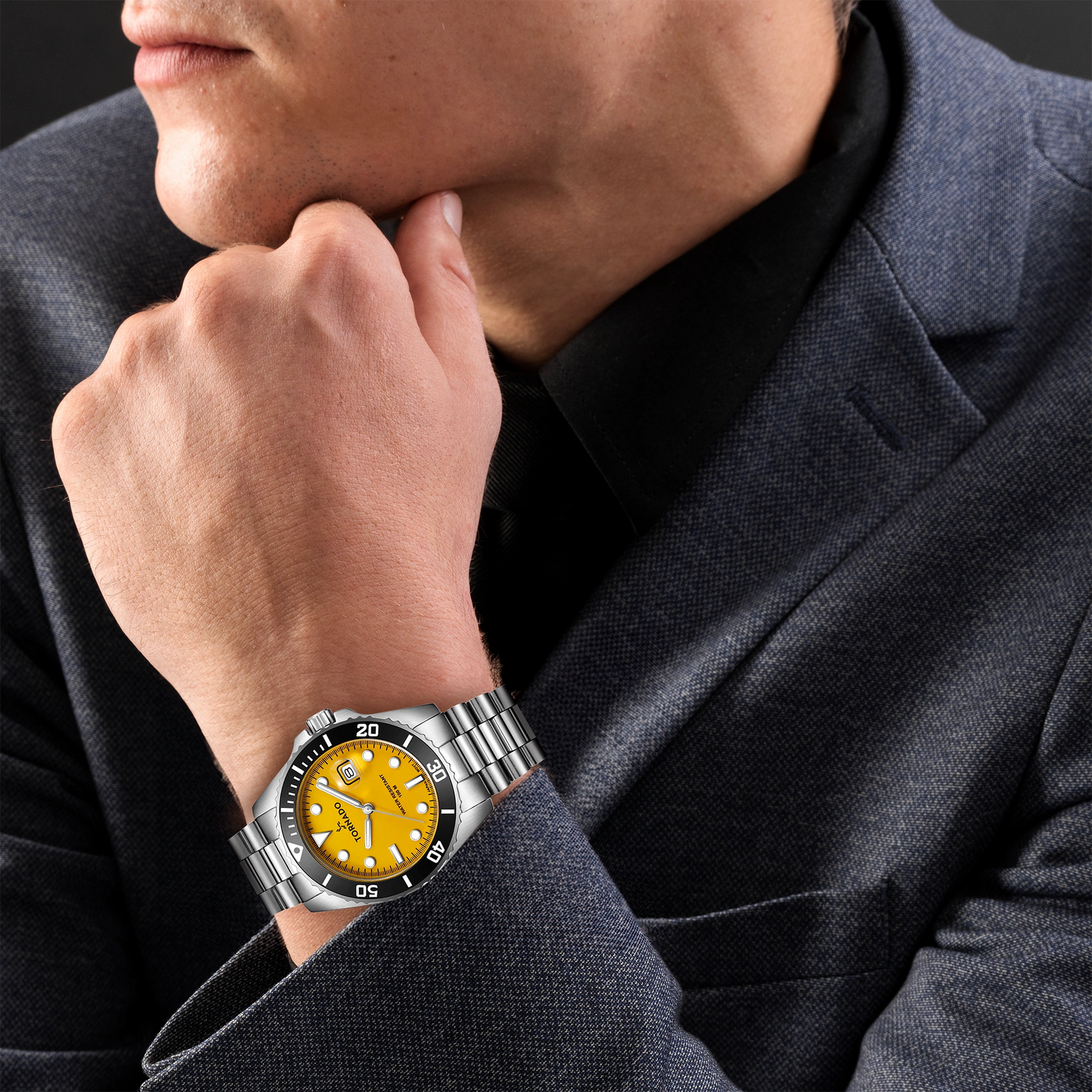 Bold color meets classic hardware. a vivid yellow dial framed by a ceramic timing bezel, sapphire-coated crystal with a magnified date, and luminous markers for high-contrast clarity day or night. The polished solid stainless-steel presidential bracelet elevates the whole piece?substantial, mirror-finished center links and brushed outers that catch light with every move, secured by a push-button deployant for a clean, tailored fit. Built in 316L steel with 10 ATM water resistance and powered by reliable Miyota 2115 quartz, it?s equal parts statement and substance. From summer suits to weekend tees, this men?s dive-style watch brings color, confidence, and real utility to US style. Durable, comfortable, and unmistakably luxury on the wrist.Keywords: men?s yellow dial watch, ceramic bezel, sapphire-coated crystal, magnified date, stainless-steel bracelet, 10 ATM.