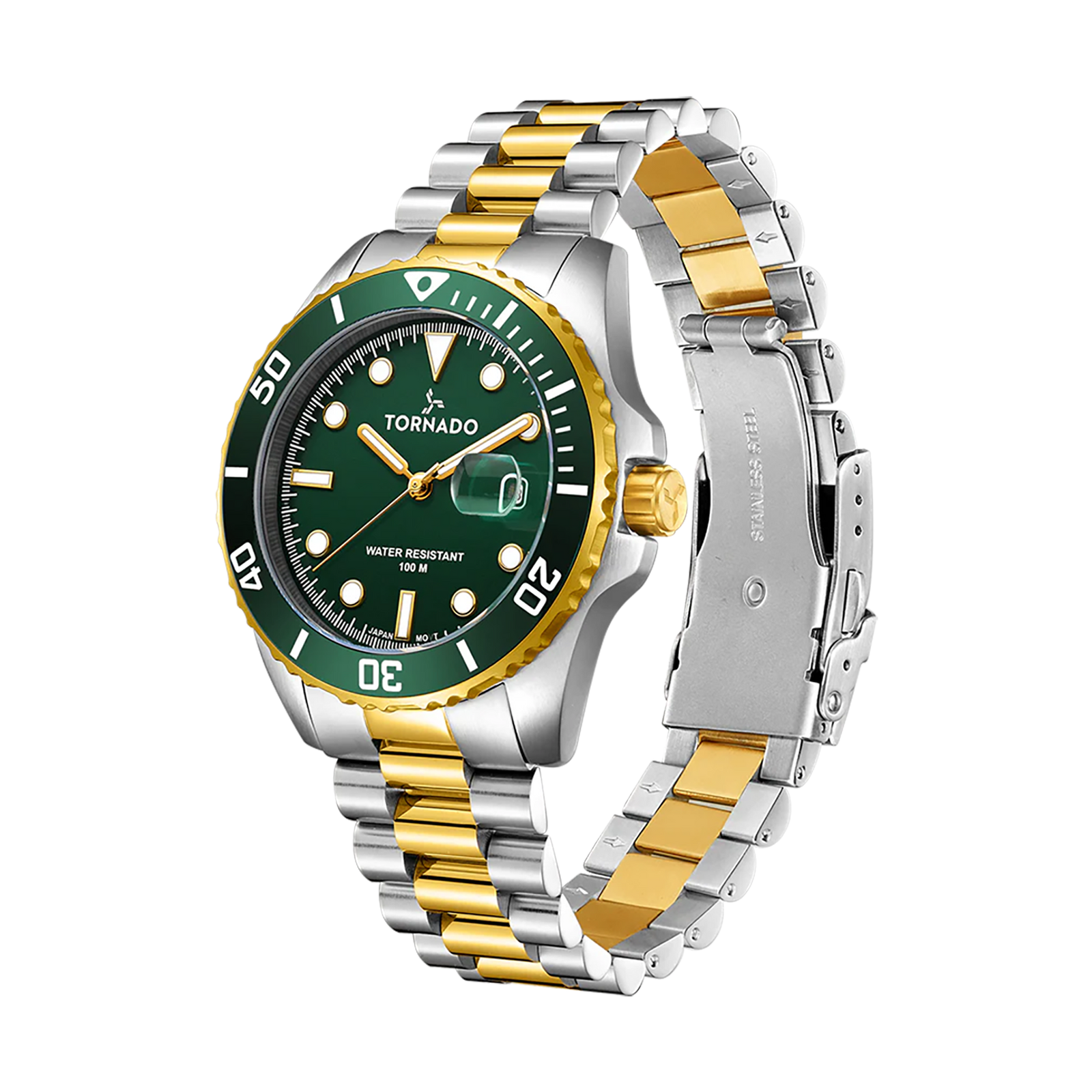 Two-tone polish with tool-watch credibility.The green dial, rotating ceramic bezel and sapphire-coated crystal with magnified date handle daily tasks; luminous markers and the high grade solid stainless steel presidential bracelet add upscale presence.Ideal for events, business travel and everyday rotation, this men?s watch is 10 ATM water resistant and powered by reliable Japanese Miyota quartz movement. A 3-year warranty covers the build.