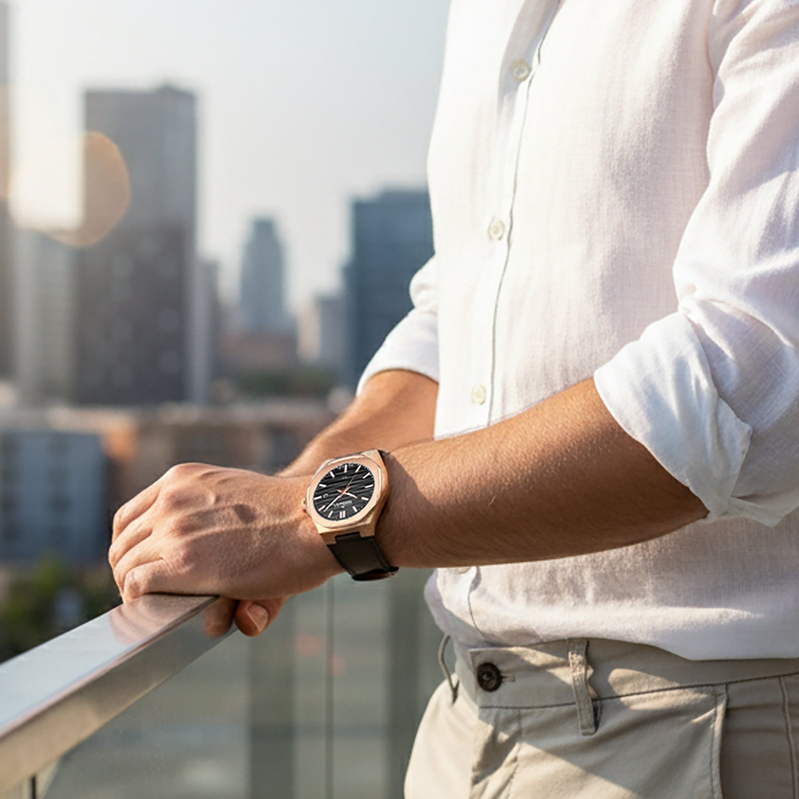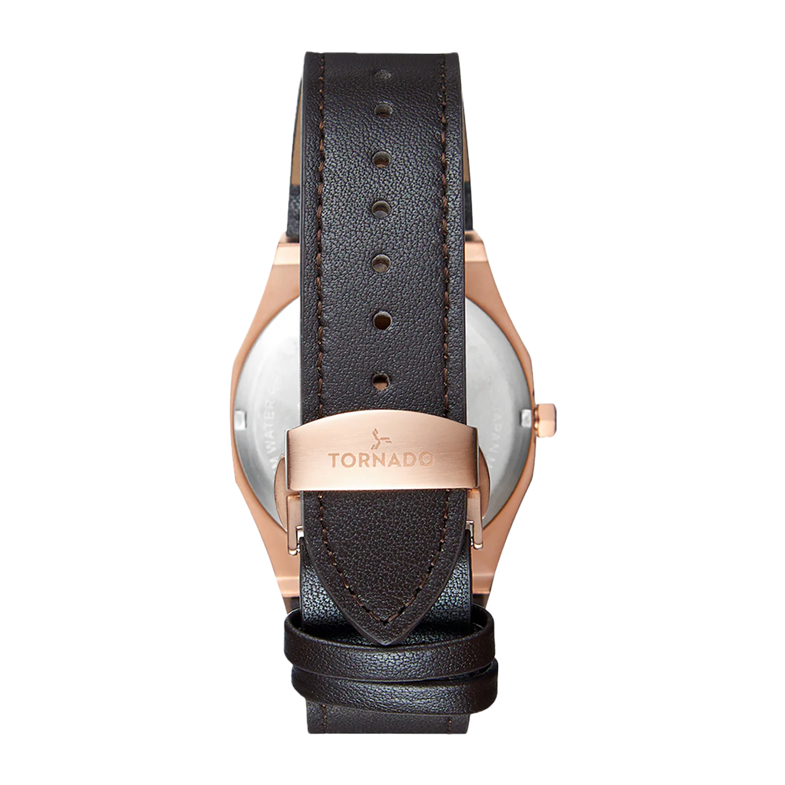 Tornado Spectra's Watch features a black dial, rose gold case, and brown leather strap. Powered by Japan Quartz movement and protected with mineral glass. Water resistant 10ATM. 3-year warranty included.