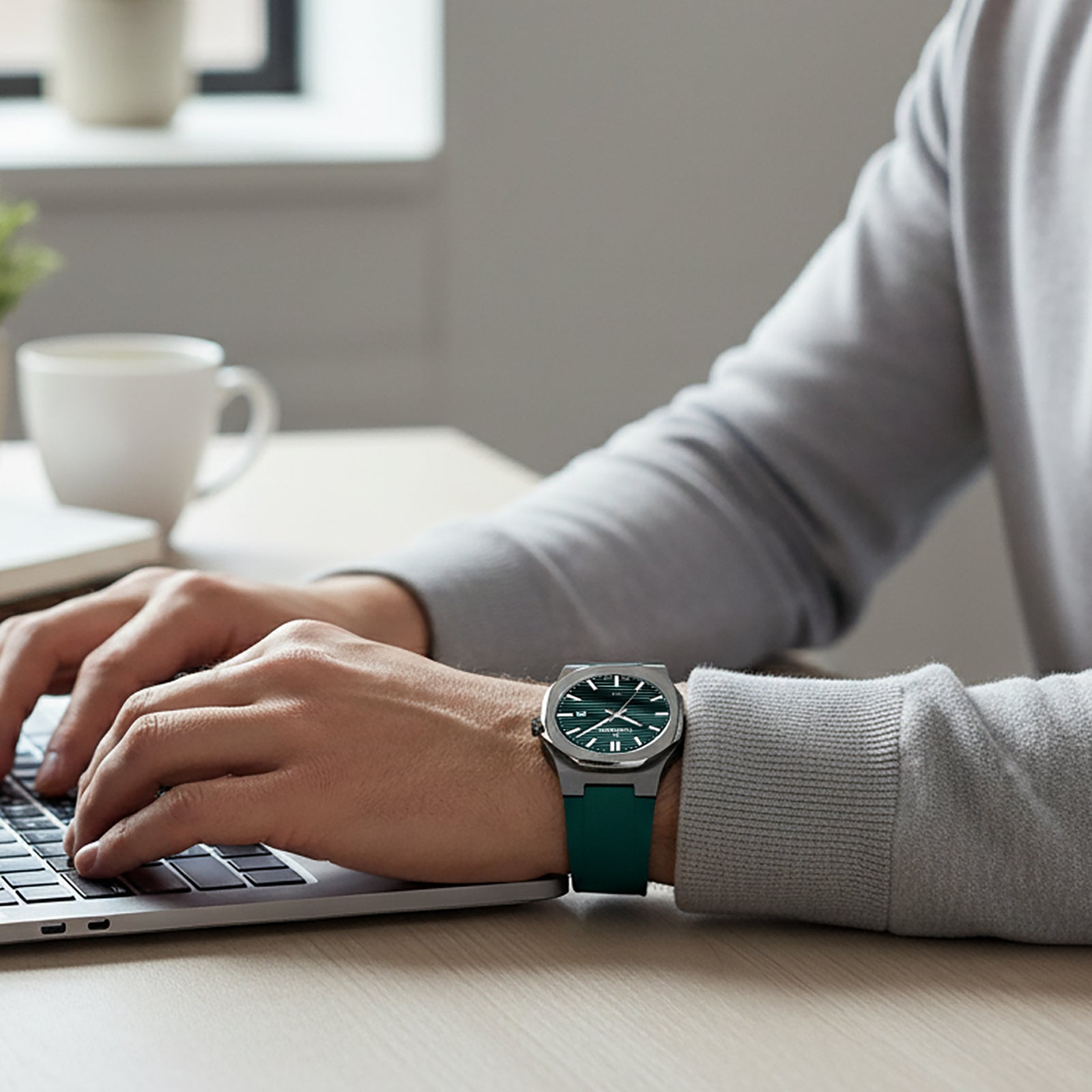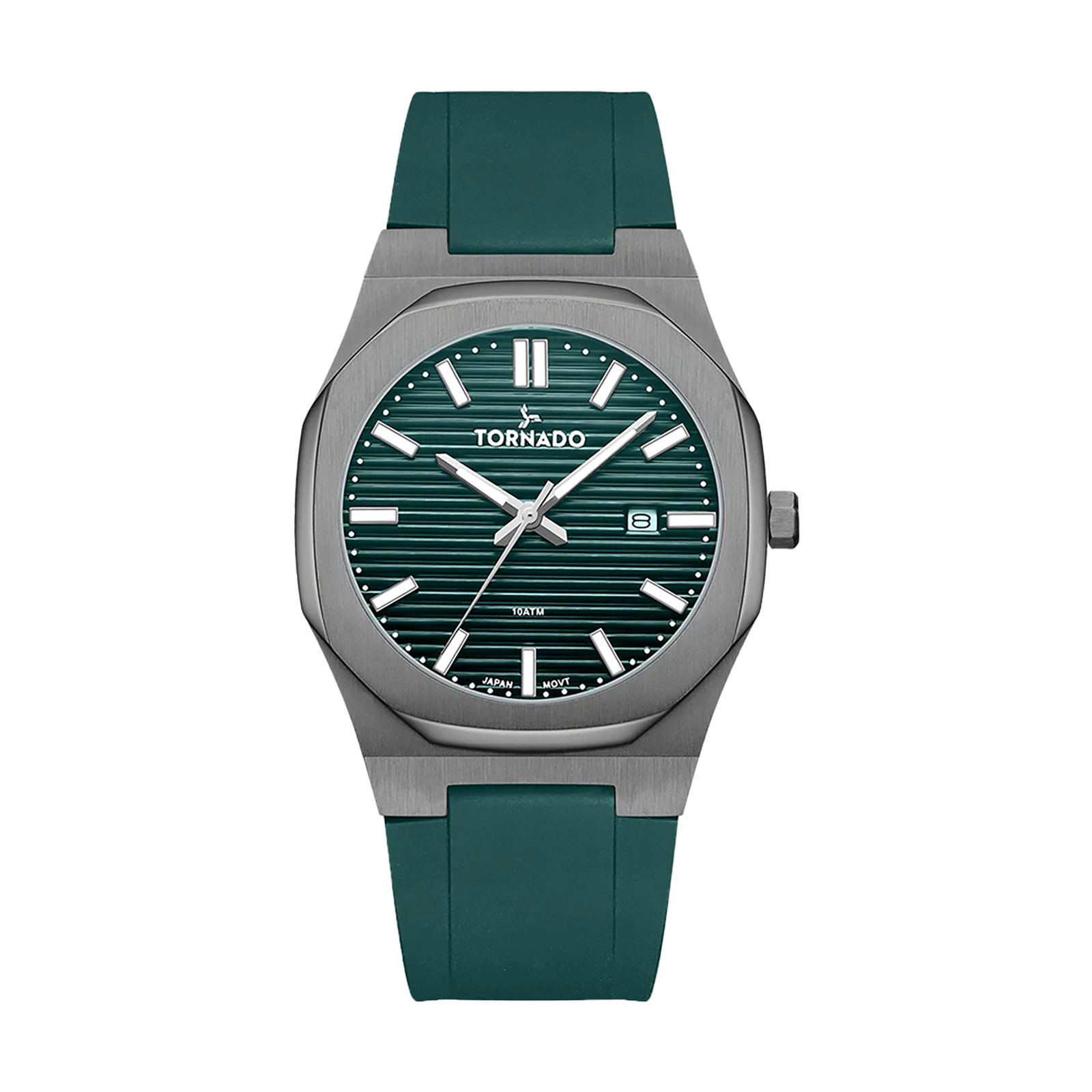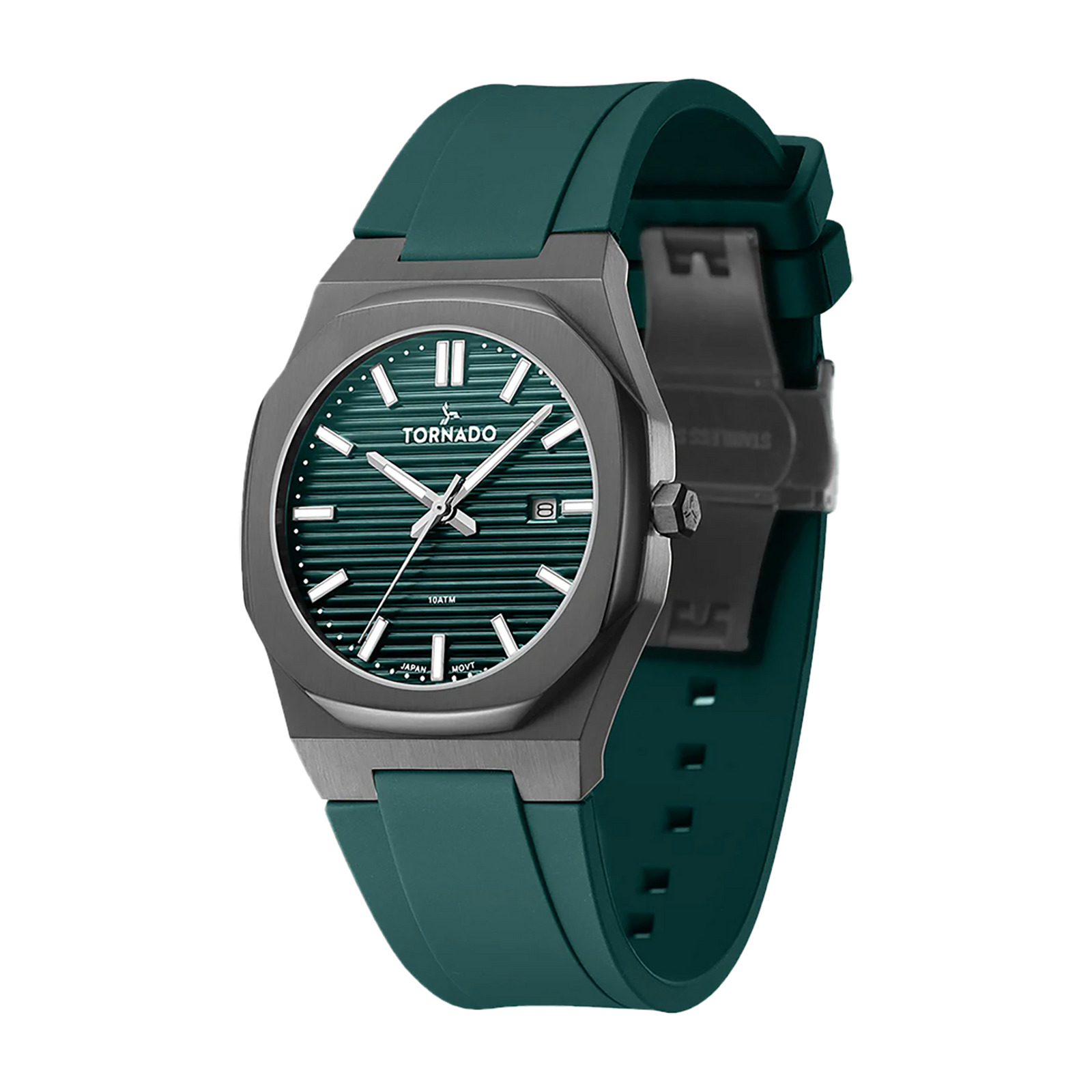 Tornado Spectra's Watch with green dial, gunmetal case, and green silicone strap. Japan Quartz movement, mineral glass protection. 10ATM water resistant. 3-year warranty included.