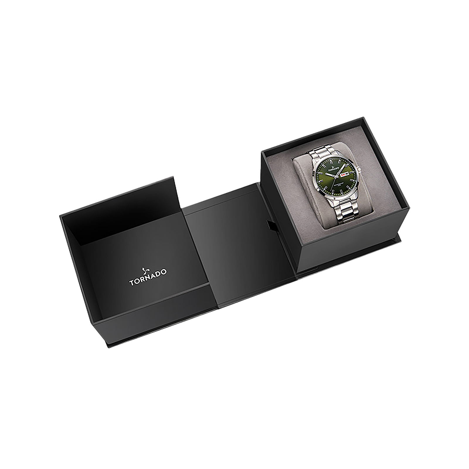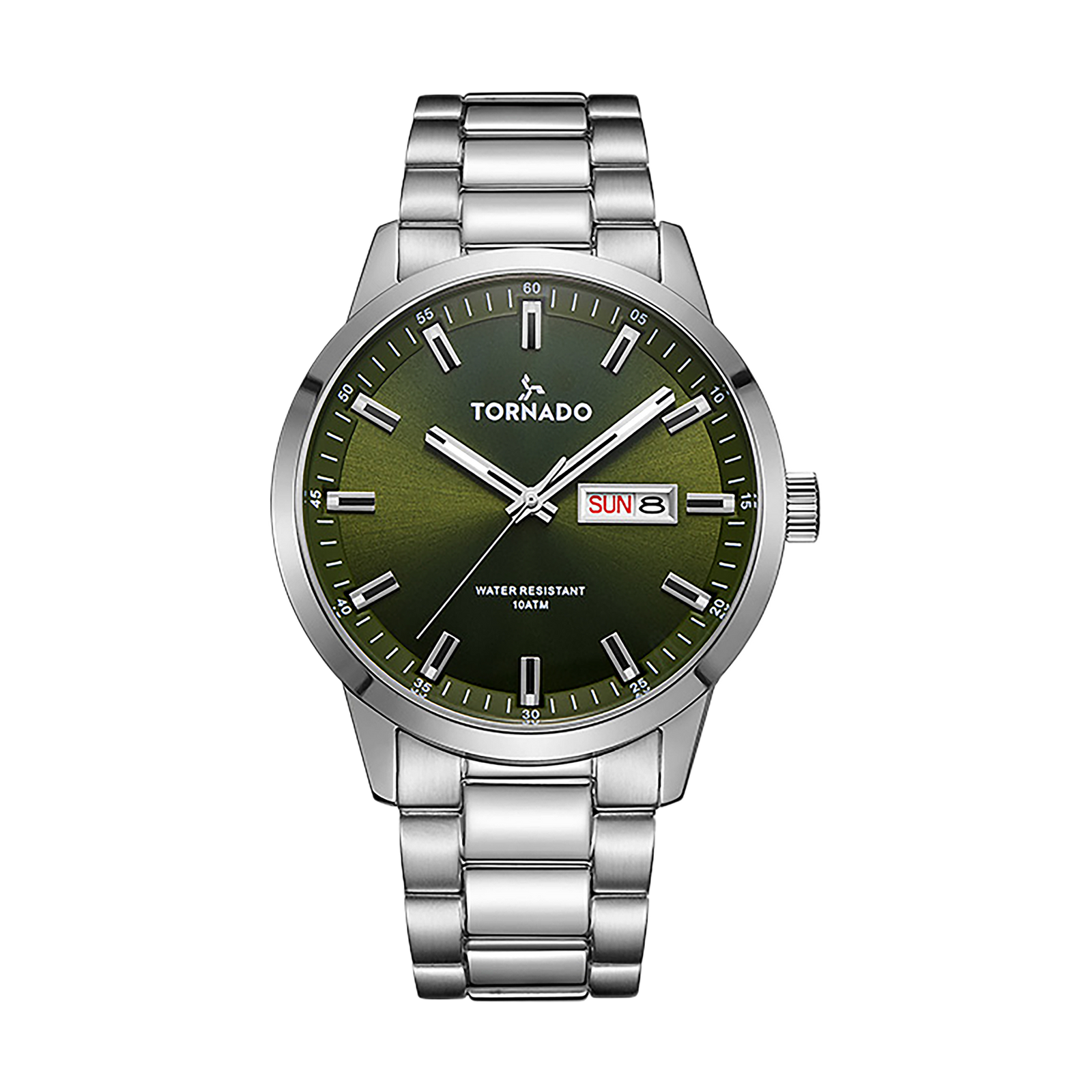 Tornado Spectra's Watch with green dial, silver case and strap. Miyota 2305 movement, dome sapphire coated glass. 10ATM water resistant. 3-year warranty included.