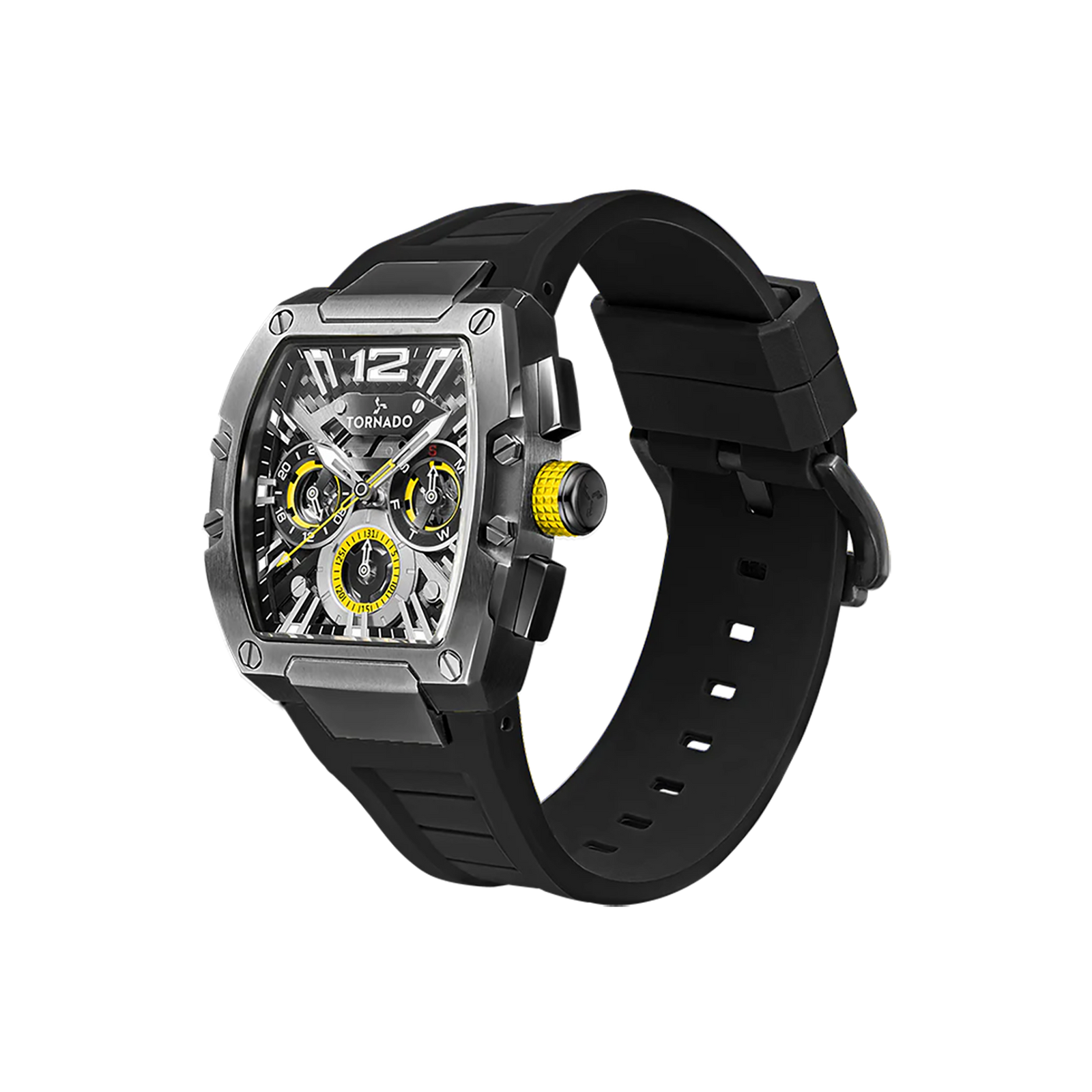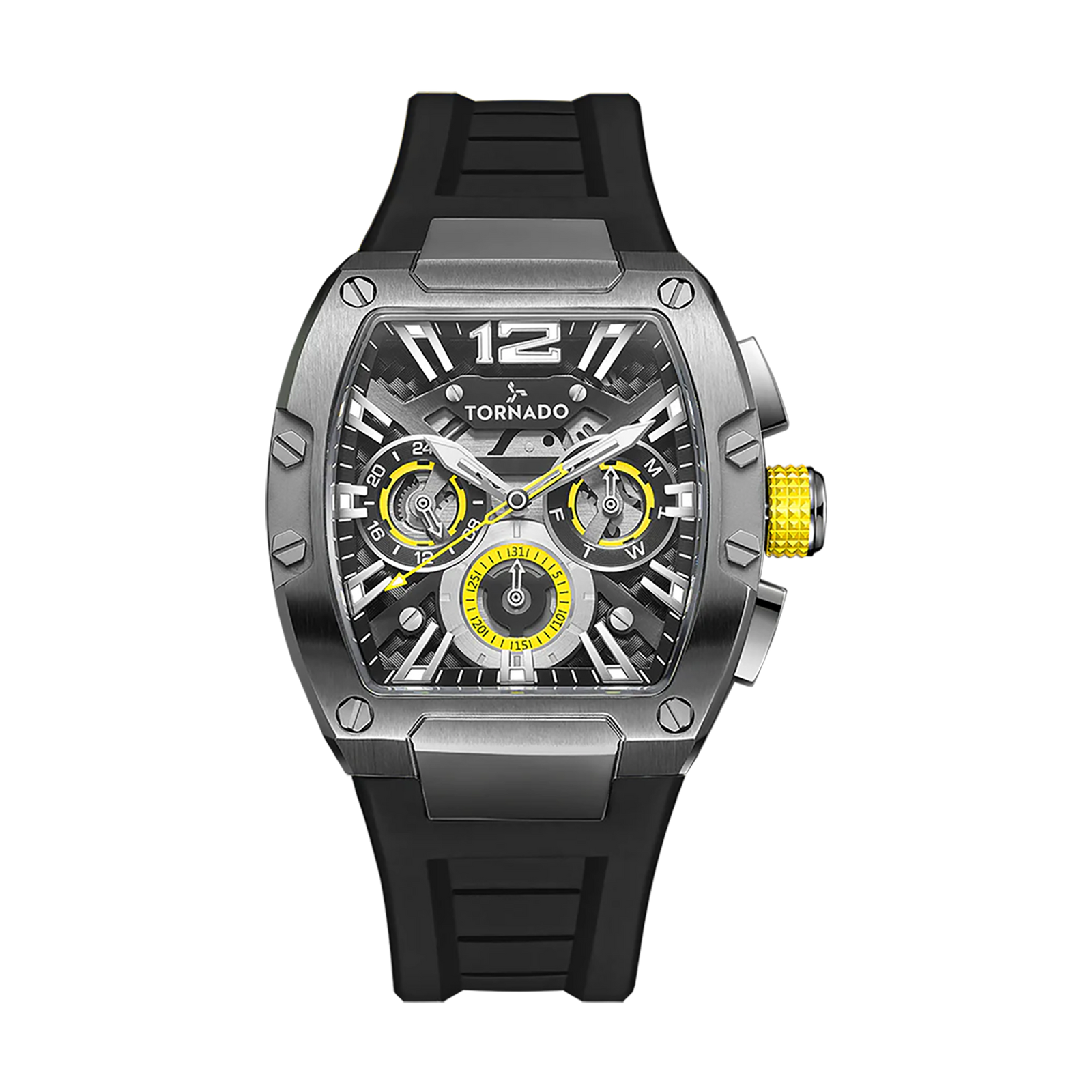 Stealth with a spark. Brushed gunmetal stainless steel and a layered dark dial meet crisp yellow accents for a technical, modern look. A sapphire-coated crystal and luminous markers keep it sharp day to night; the flexible black silicone strap wears light. The Japanese quartz multifunction movement (day/date) adds practicality without bulk. Wear it with all-black fits, white tees, charcoal knits and dark denim; the yellow details echo sneaker or cap accents. Rated 10 ATM for weather and short swims and covered by a 3-year warranty, it?s the clean, go-anywhere piece that still turns heads.