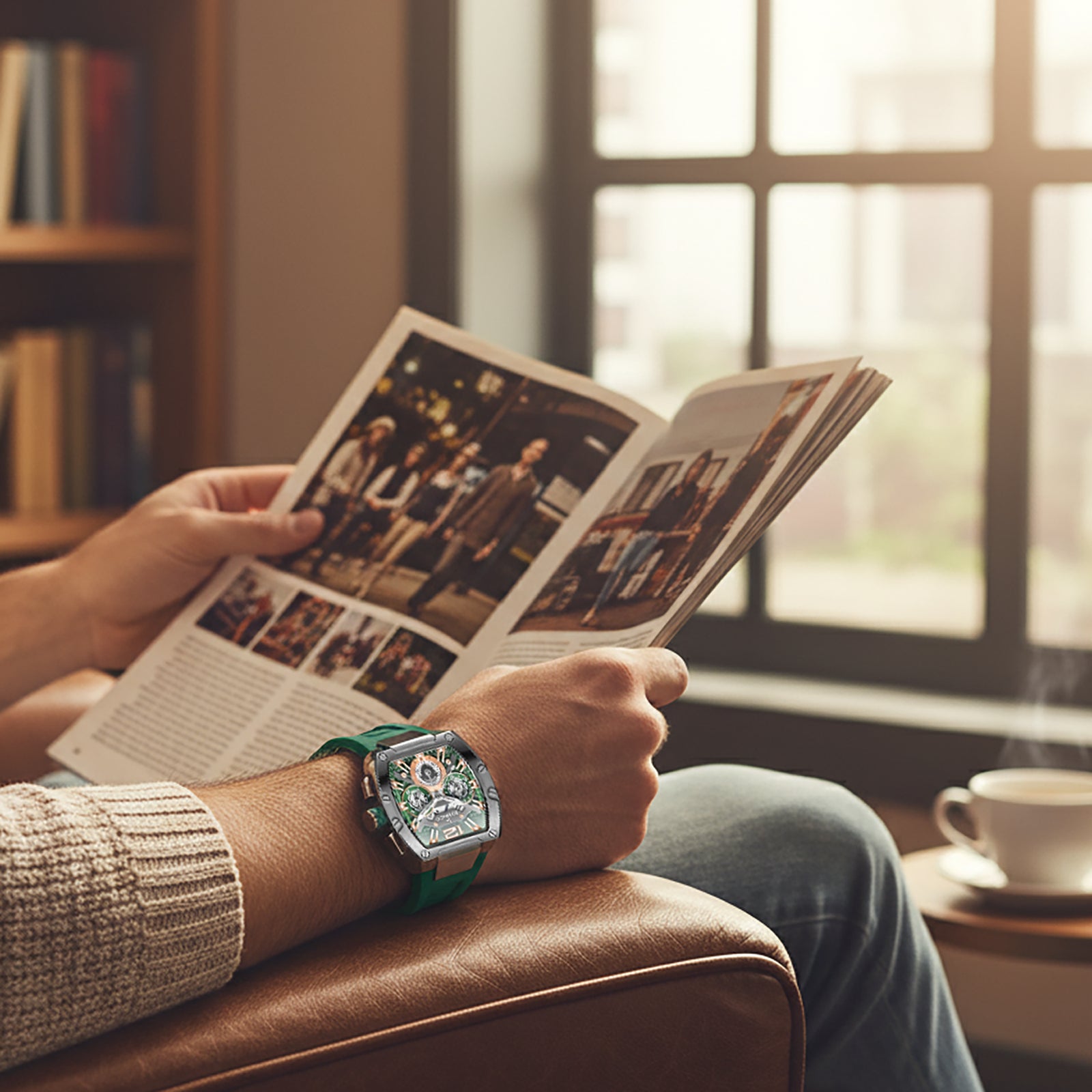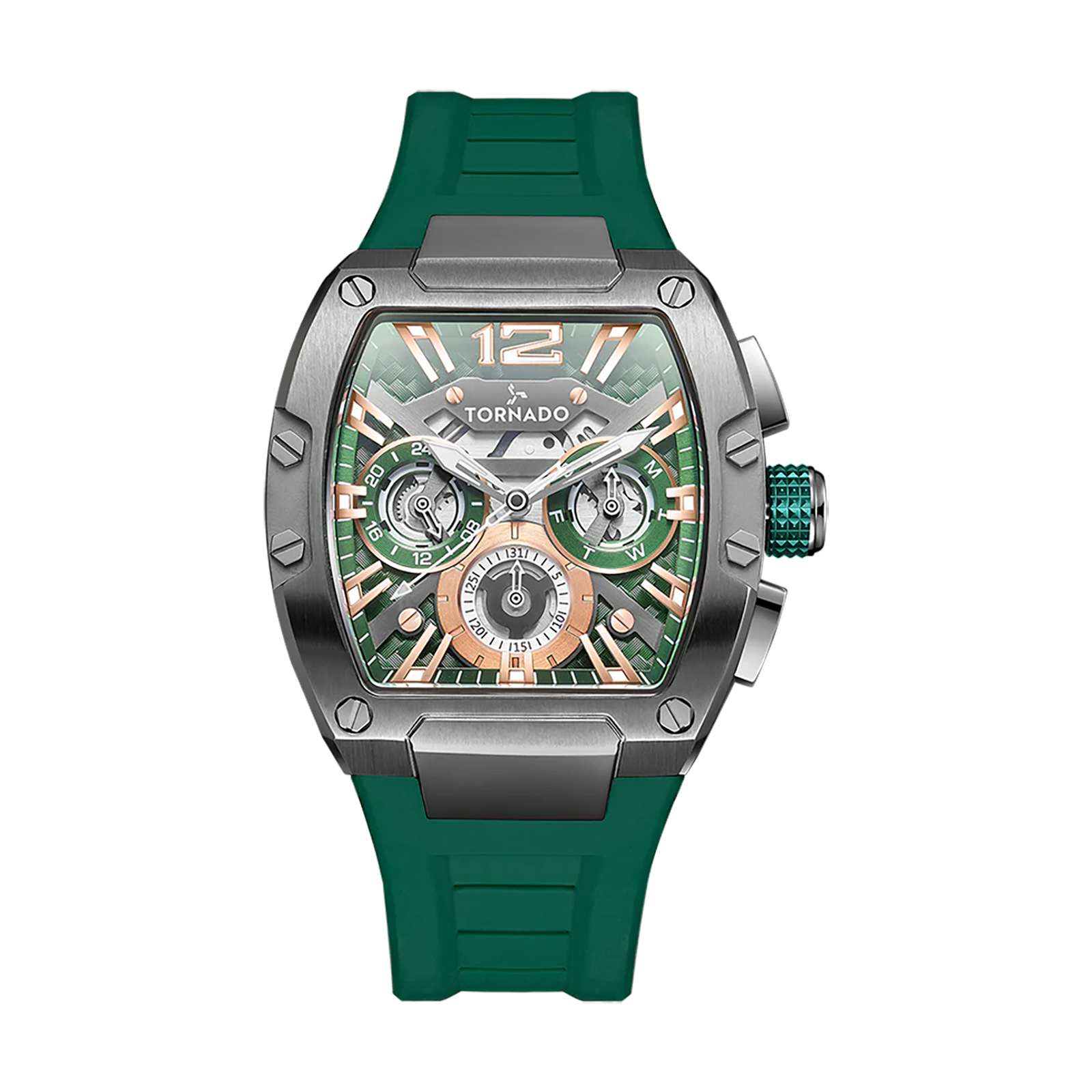 Refined sport with confident color. A brushed gunmetal 316L stainless steel tonneau case frames a layered dial with forest-green depth and warm rose-gold hints, protected by a sapphire-coated crystal. Luminous markings and a soft silicone strap make it easy all-day wear; the Japanese quartz multifunction adds day/date utility without bulk. Pair with navy, charcoal and earth tones for work, travel and weekends. 10 ATM water resistance and a 3-year warranty complete the build.