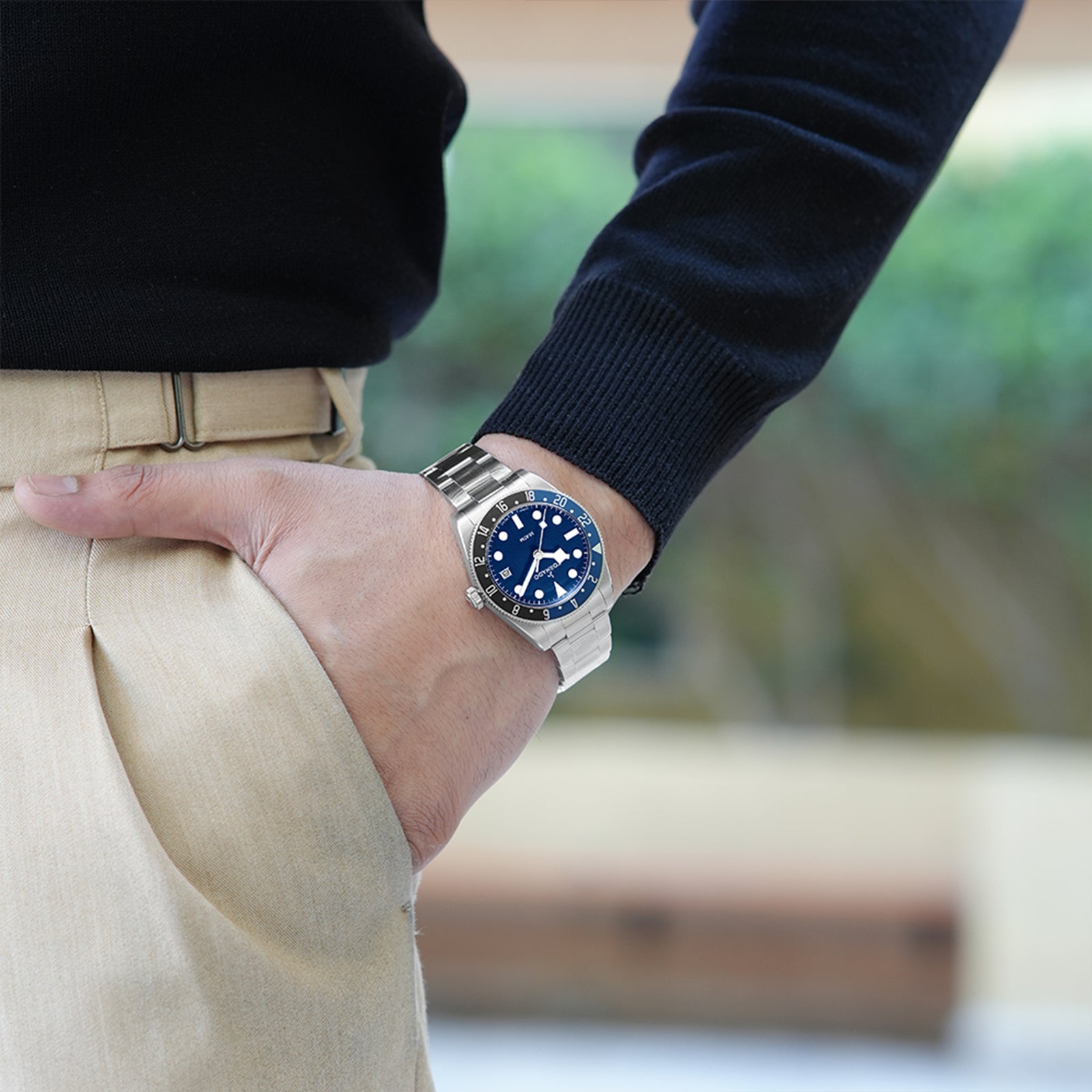 Tornado Lumina Date Just's Watch with blue dial, silver case, and strap. Japan 2315-3H movement, sapphire coated glass. 10ATM water resistant. 3-year warranty included.