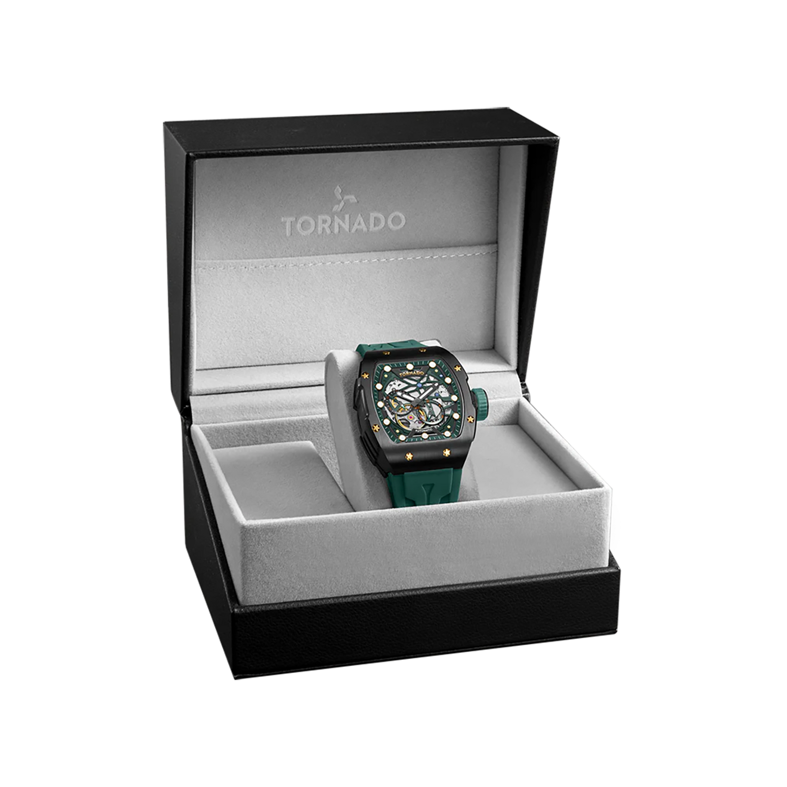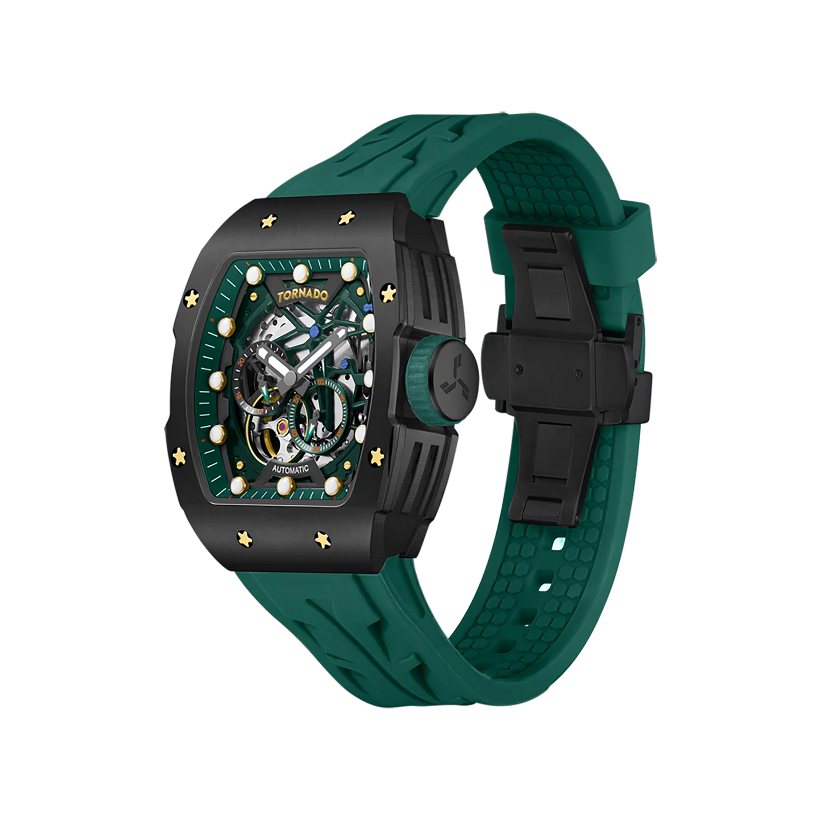 Statement mechanics with rich color. A black brushed stainless steel case with gold hardware surrounds an open-worked dial; the Miyota 82S7 Japanese automatic is visible through a sapphire-coated crystal. Luminous markers glow cleanly; a butterfly clasp and deep-green silicone strap complete the luxury-sport build. Ideal with black, gray, white and olive fits, this men?s automatic brings eye-catching depth without sacrificing comfort. 10 ATM water resistance and a 3-year warranty make it a striking daily automatic.