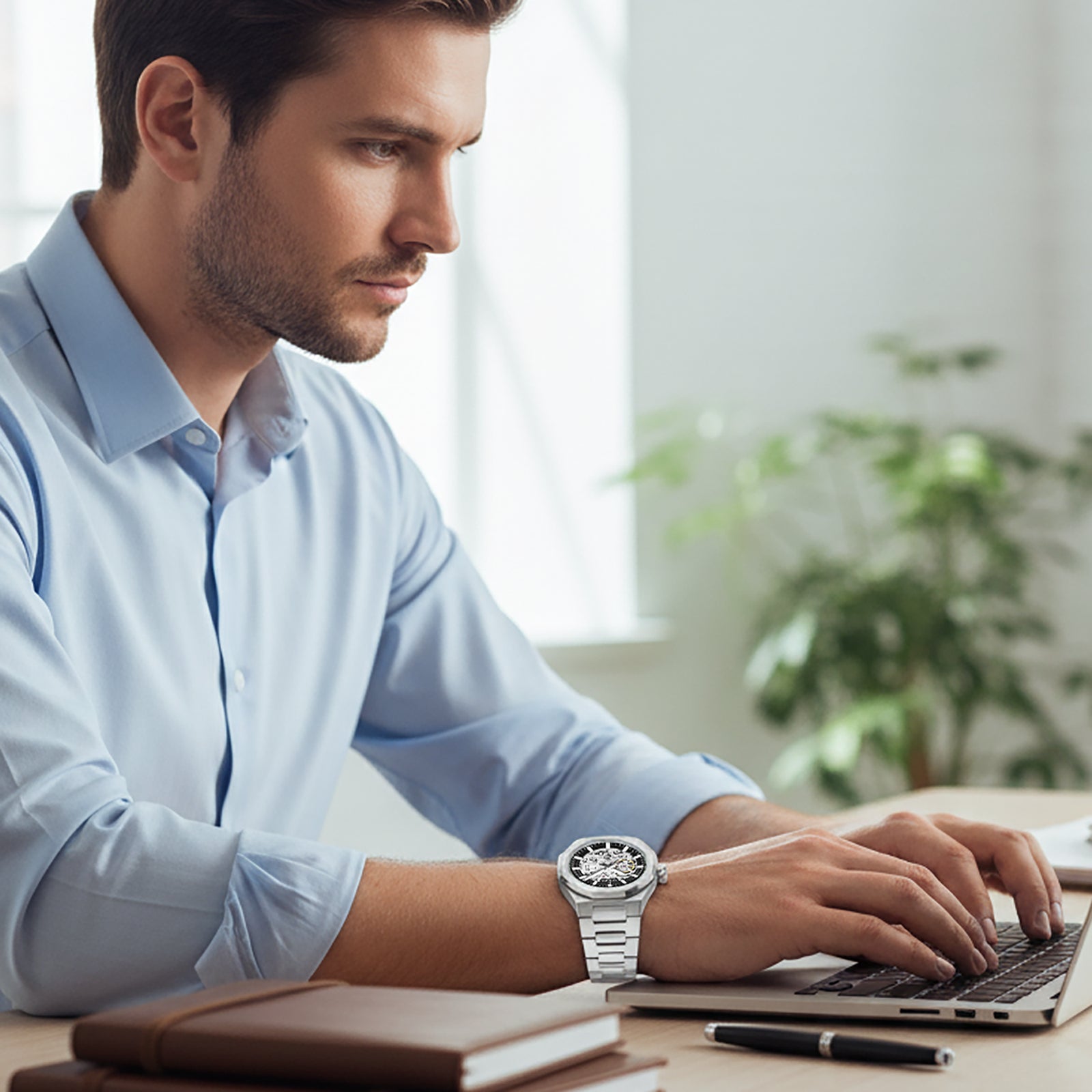 Premium automatic men?s watch with skeleton black dial showcasing mechanical movement. Powered by Seiko NH70 automatic movement, 316L stainless steel case, sapphire-coated glass, and 10 ATM water resistance.