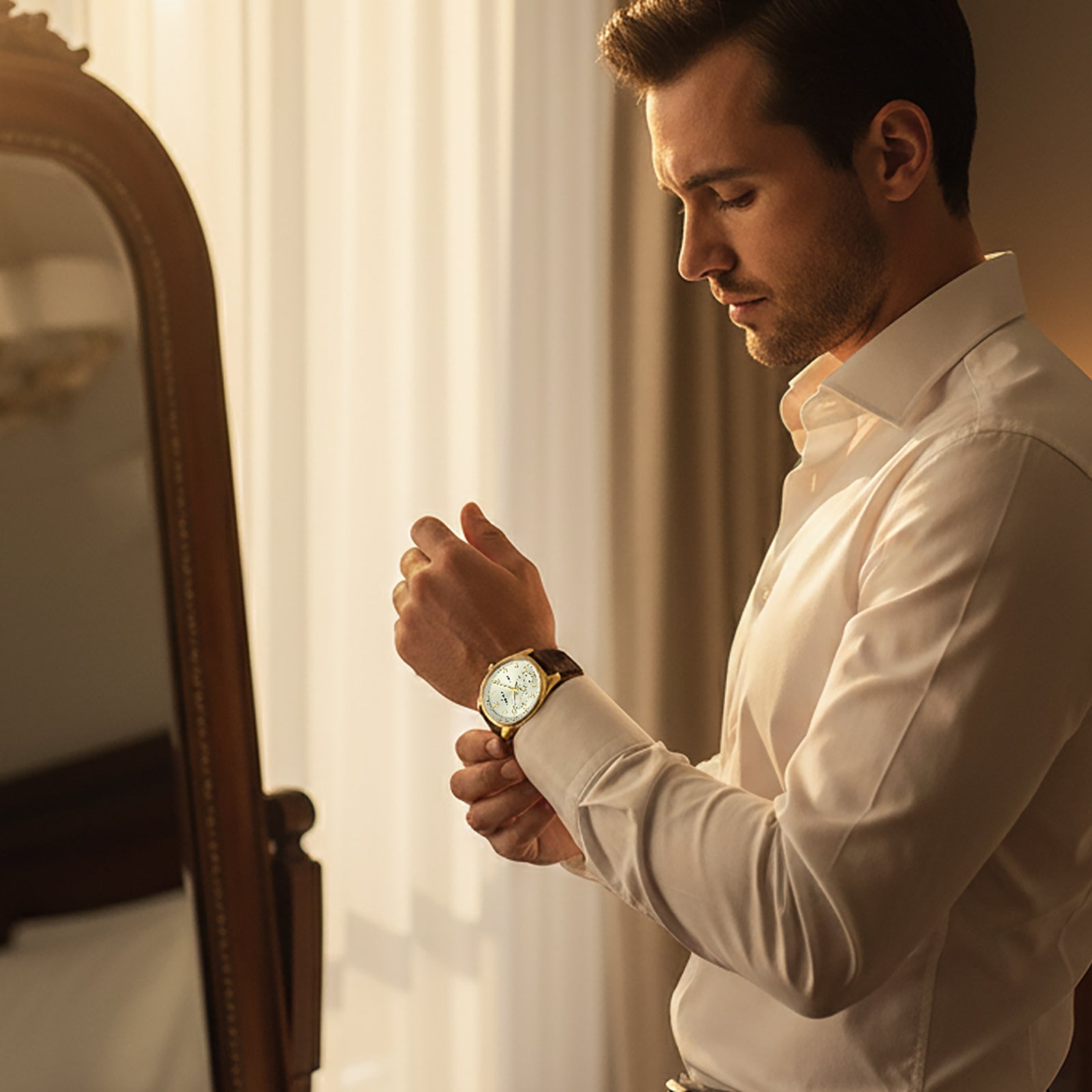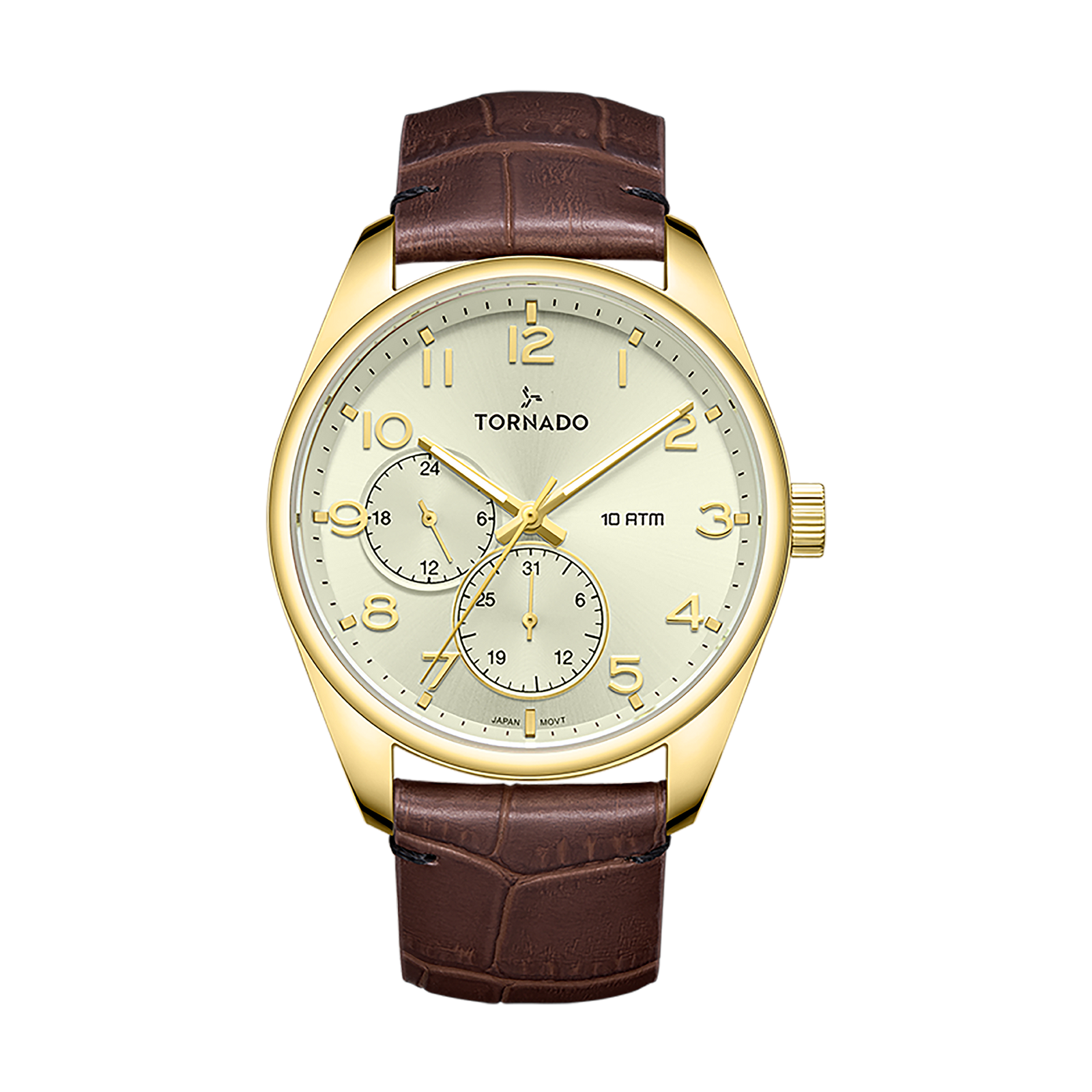 Elegant multi-function watch with champagne dial and gold case paired with brown crocodile-pattern leather strap. Powered by Seiko VX7R movement, sapphire-coated glass, and 10 ATM water resistance.