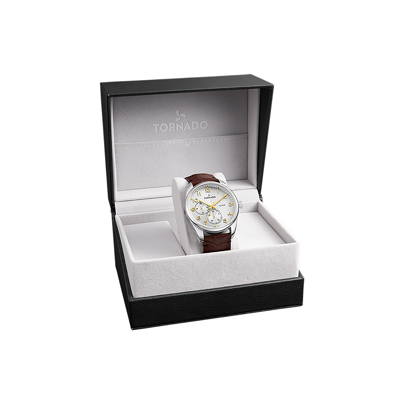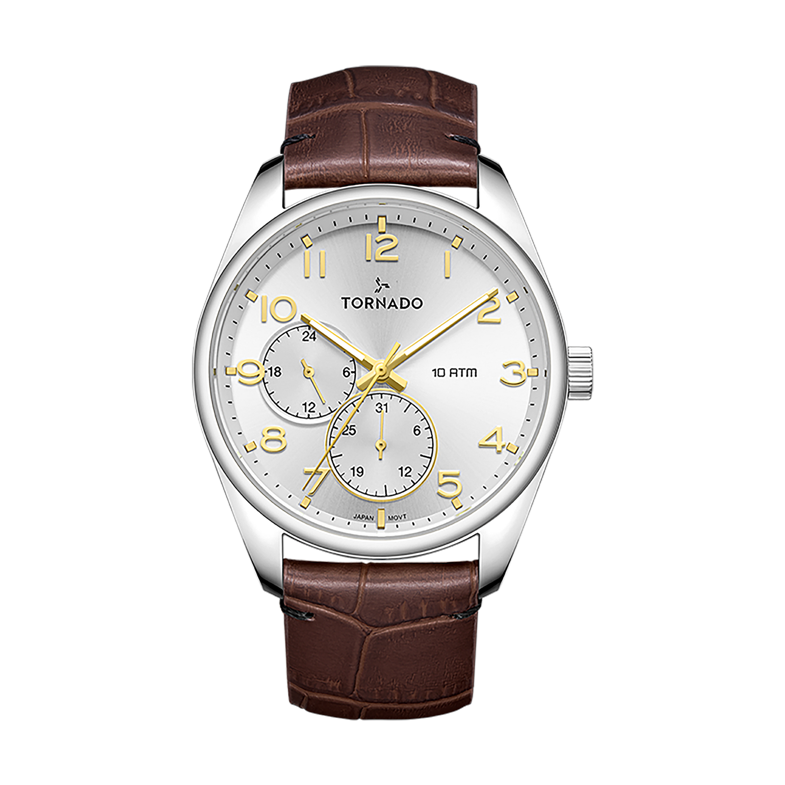 Classic white dial watch with silver case and brown leather strap. Features Seiko VX7R movement, sapphire-coated glass, and 10 ATM water resistance.