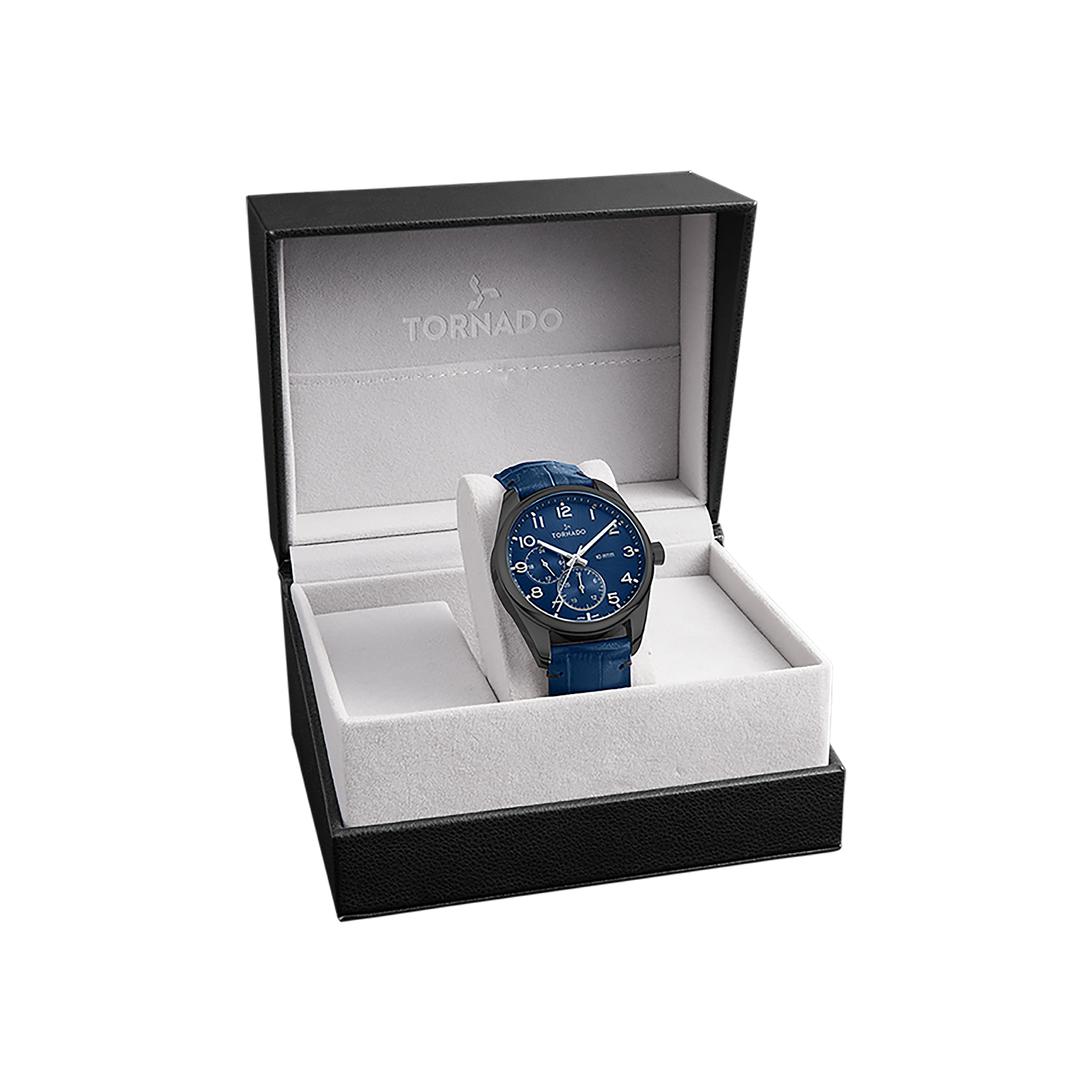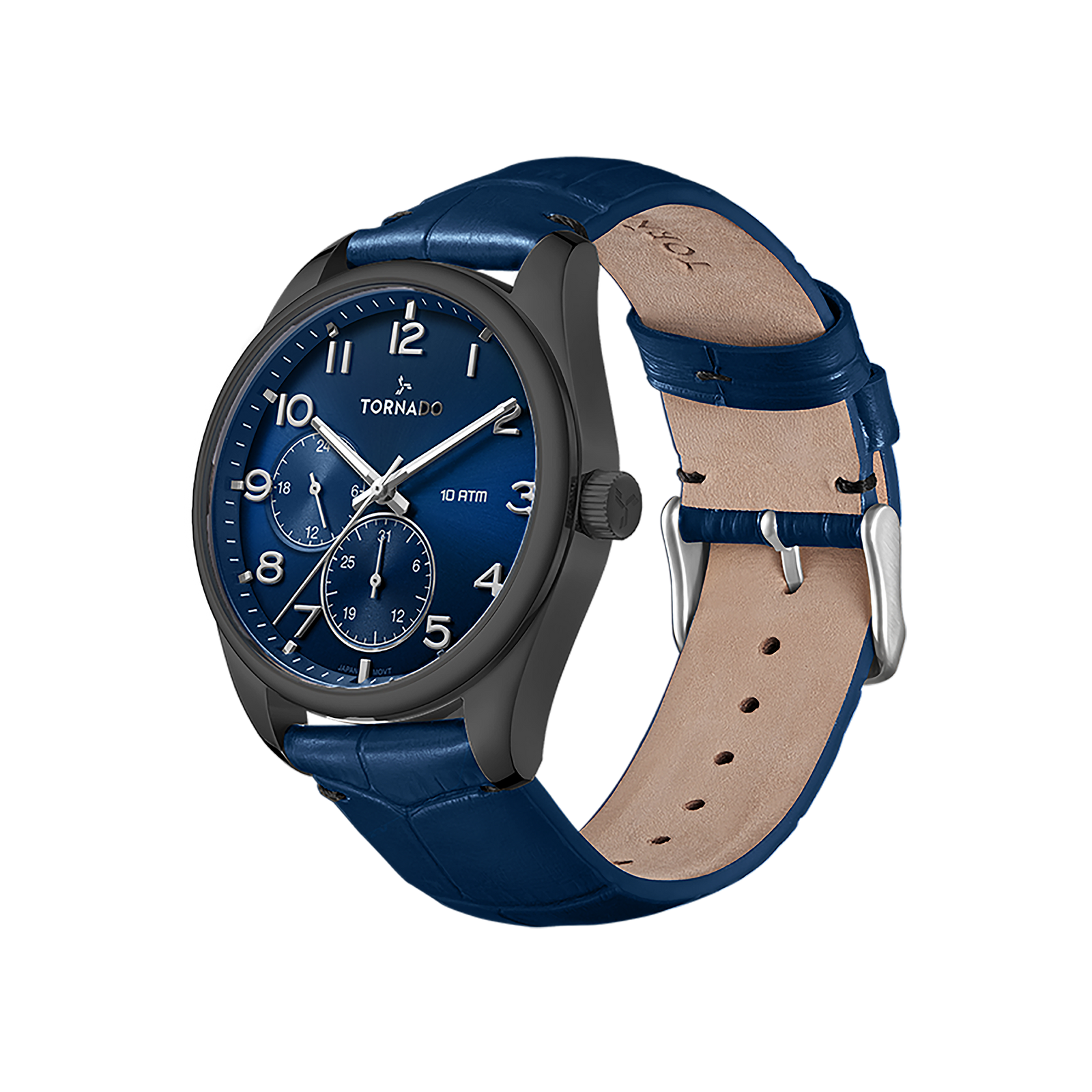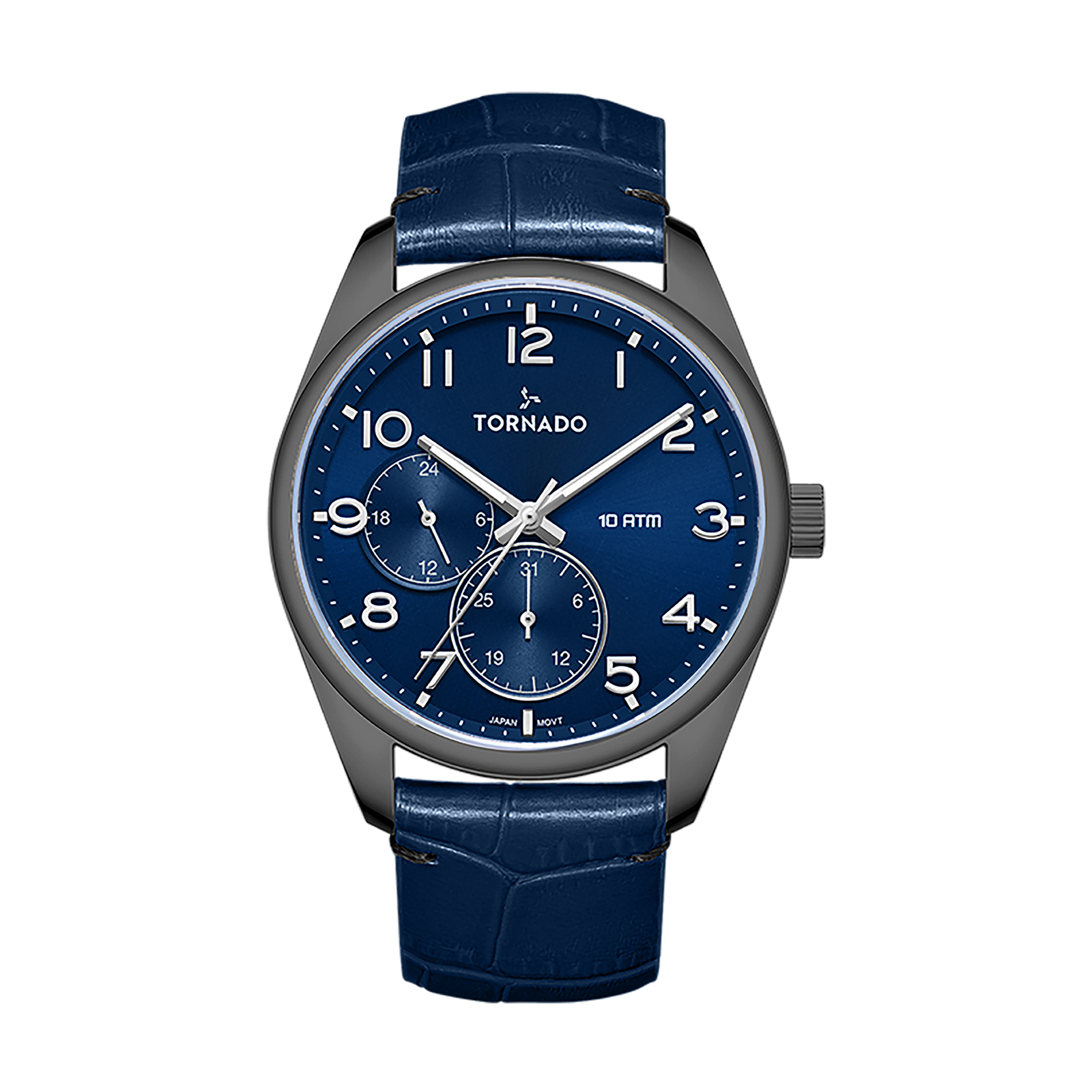 Blue dial multi-function watch with grey case and blue leather strap. Powered by Seiko VX7R quartz movement, sapphire-coated glass, and 10 ATM water resistance.
