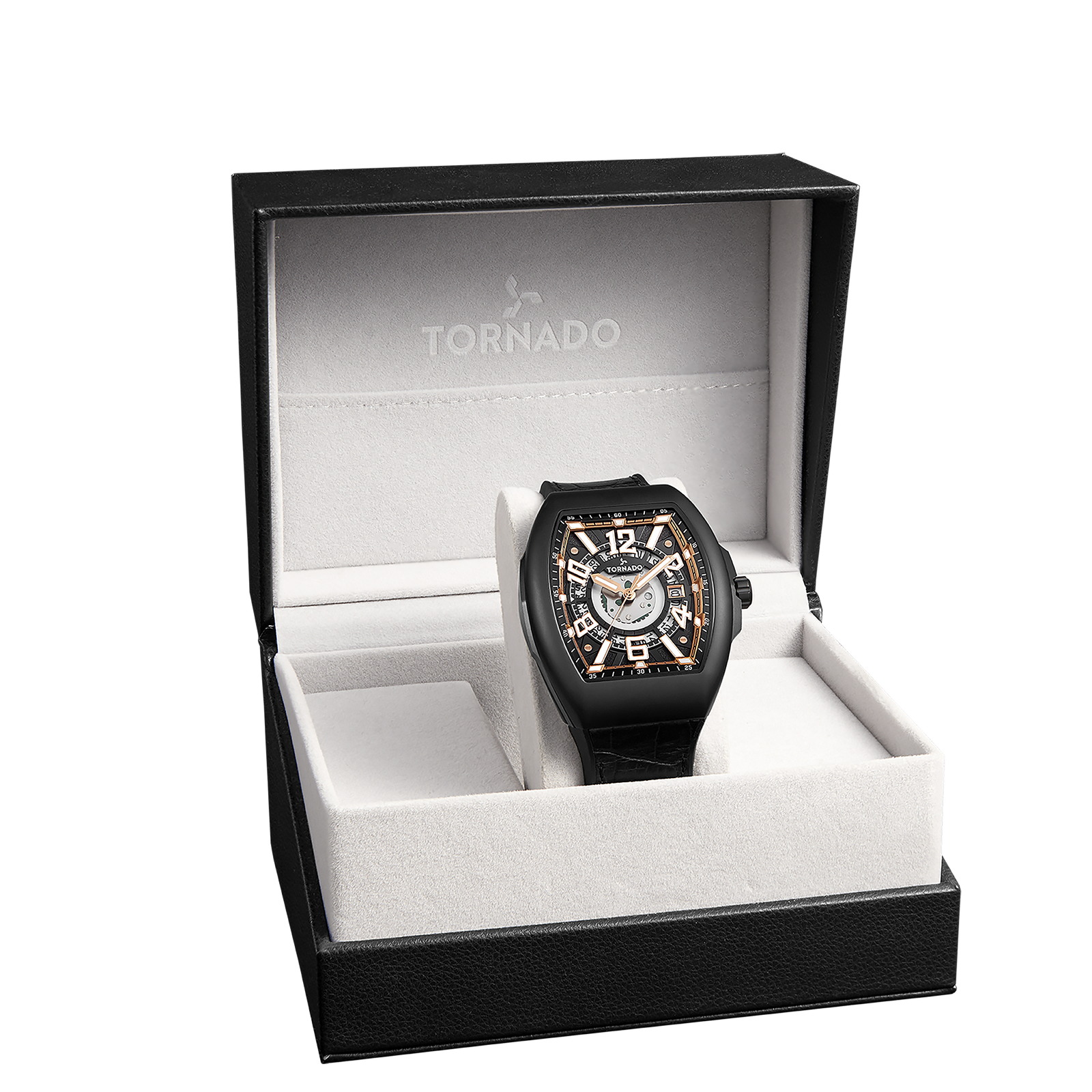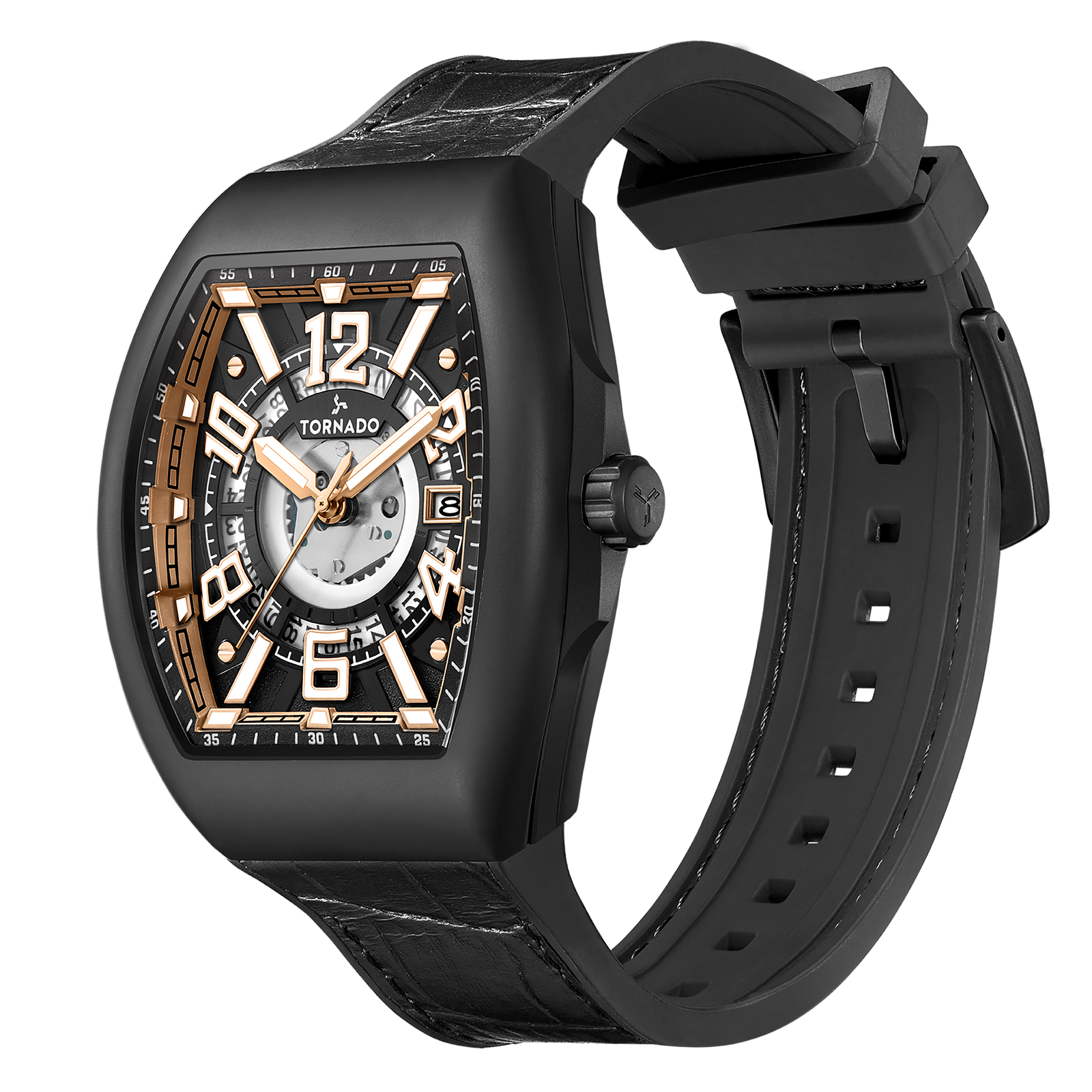 Tornado Xenith's Analog Watch with black dial, black case, and leather-rubber strap. 2315-3 Japanese quartz movement, sapphire coated glass. 5ATM water resistant. 3-year warranty included.