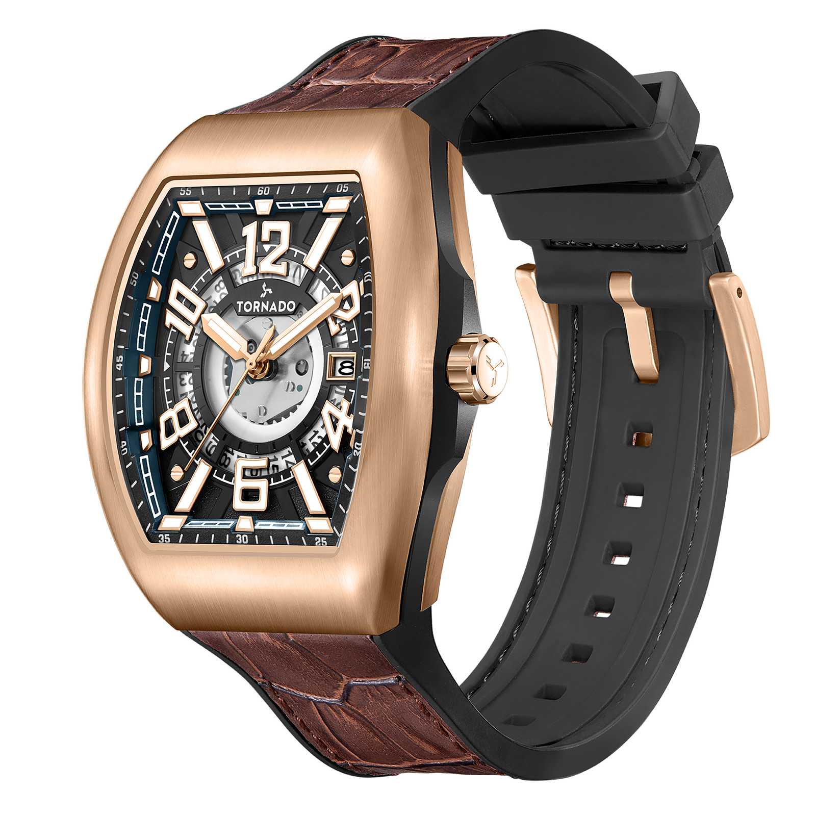 Tornado Xenith's Analog Watch with black dial, rose gold case, and brown leather-rubber strap. 2315-3 Japanese quartz movement, sapphire coated glass. 5ATM water resistant. 3-year warranty included.