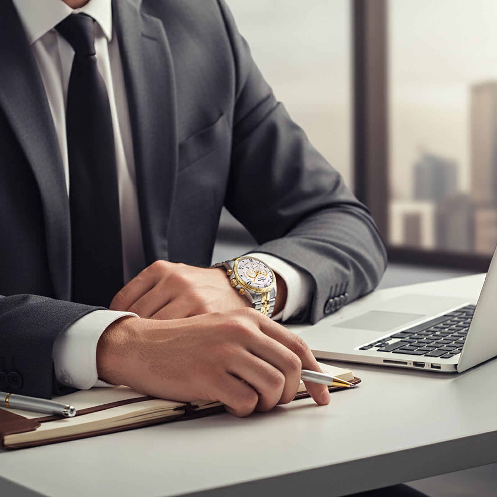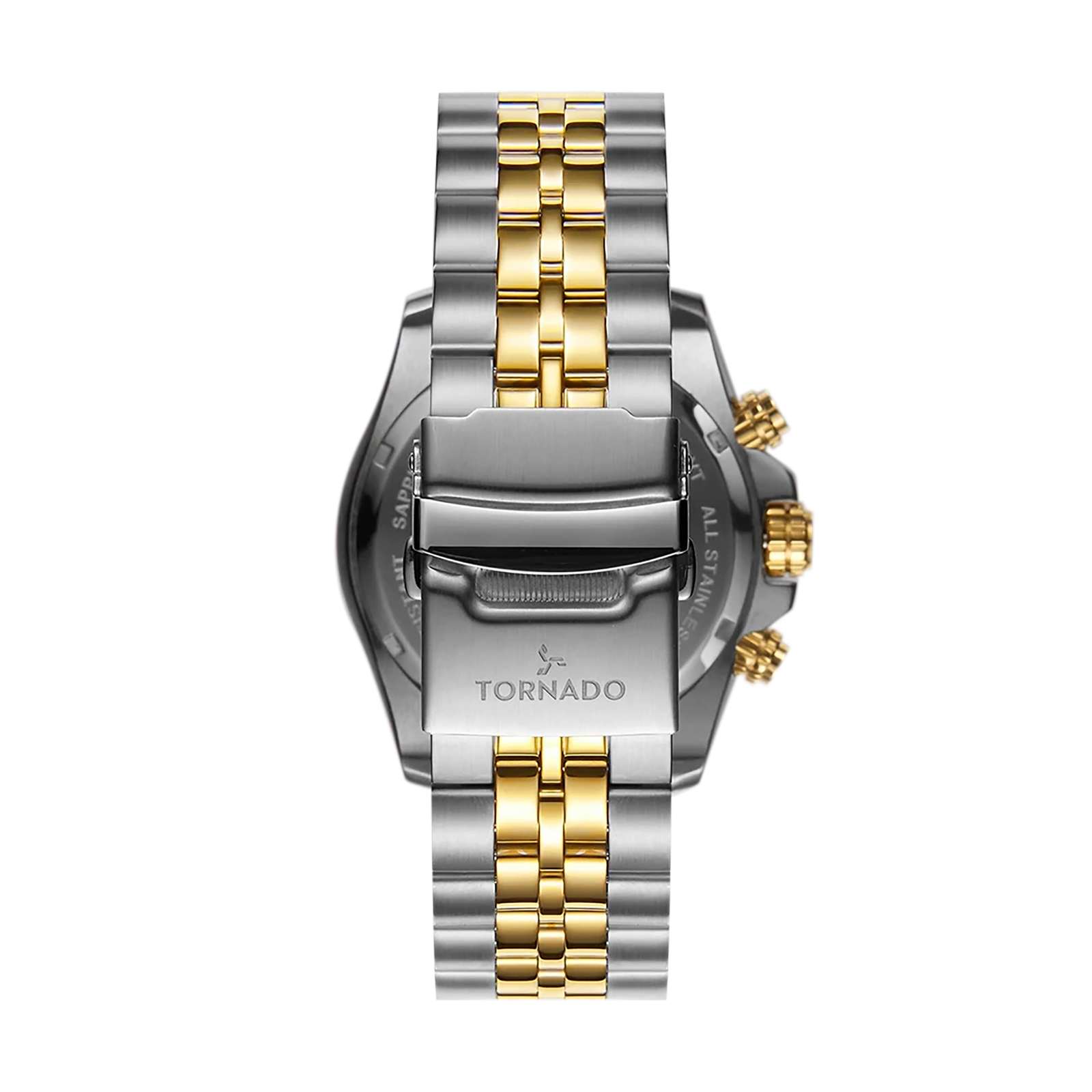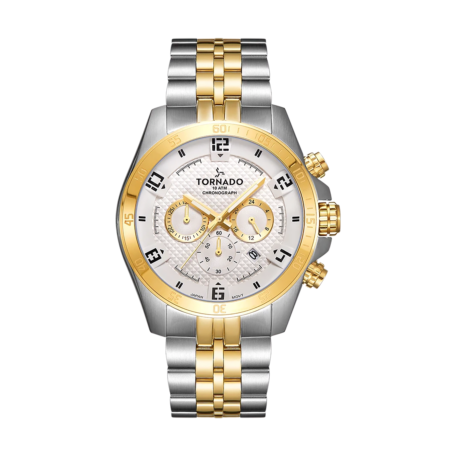 Tornado Celestia Chrono Men's Chronograph Watch with white dial, silver/gold case and strap. Japan Quartz movement, sapphire coated glass, 10ATM water resistant. 3-year warranty included.