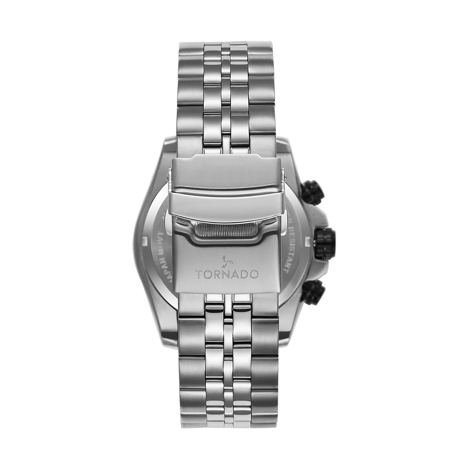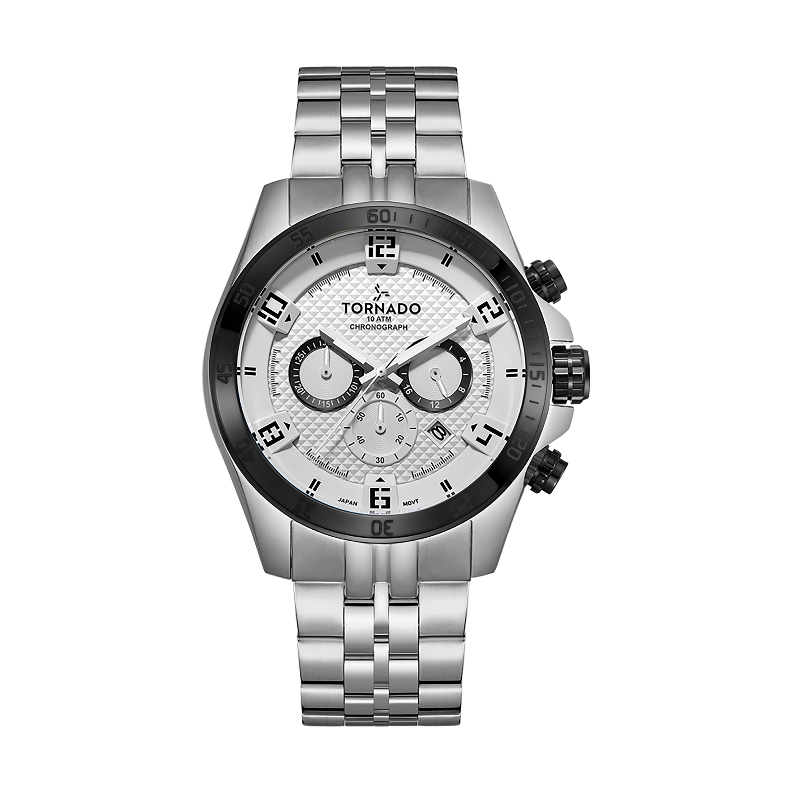 Tornado Celestia Chrono Men's Chronograph Watch with white dial, silver/black case and silver strap. MIYOTA JS25 chronograph movement, sapphire coated glass, 10ATM water resistant. 3-year warranty included.