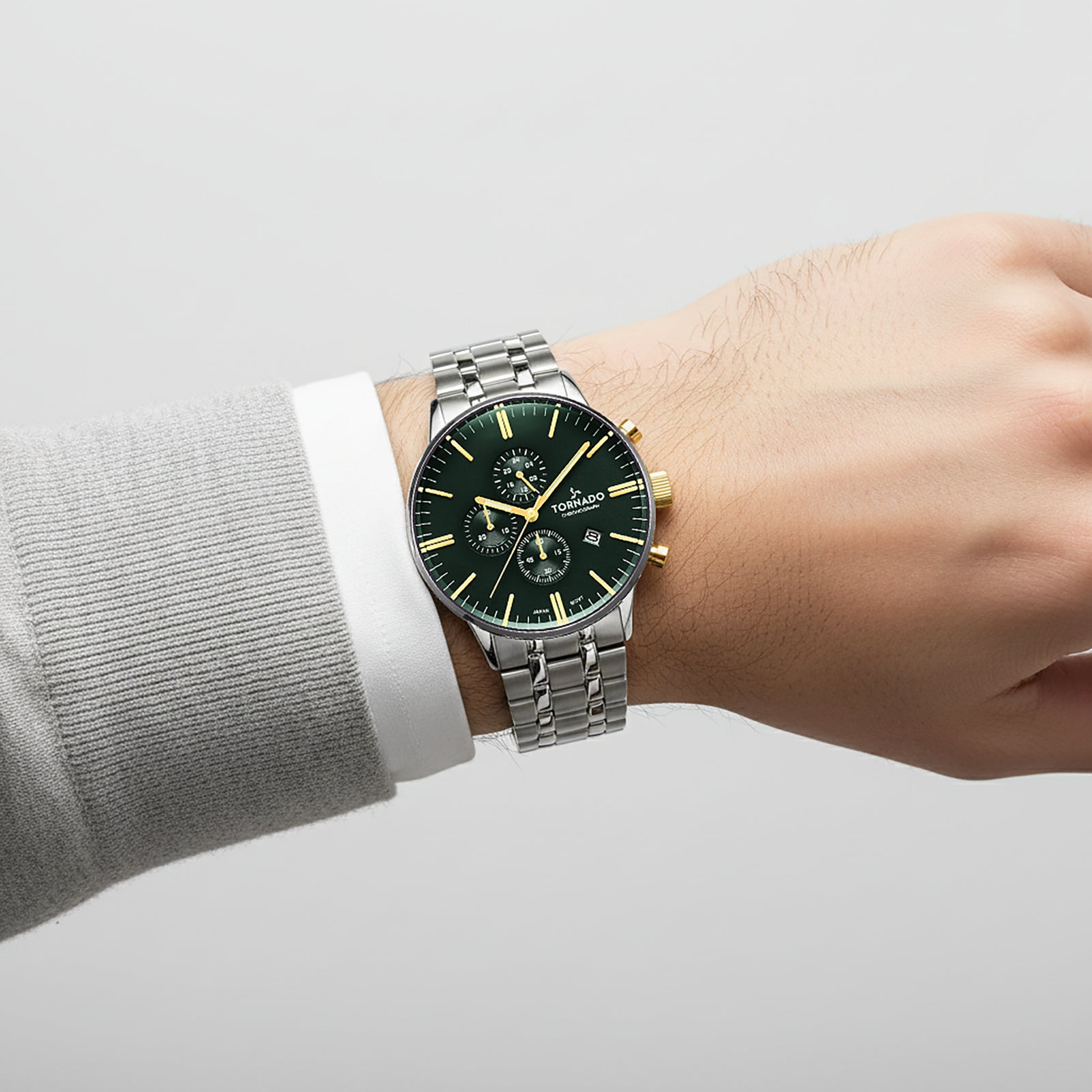 Tornado Celestia Elite Men's Chronograph Watch with green dial, silver case and strap. Japan Quartz movement, sapphire coated glass, 10ATM water resistant. 3-year warranty included.