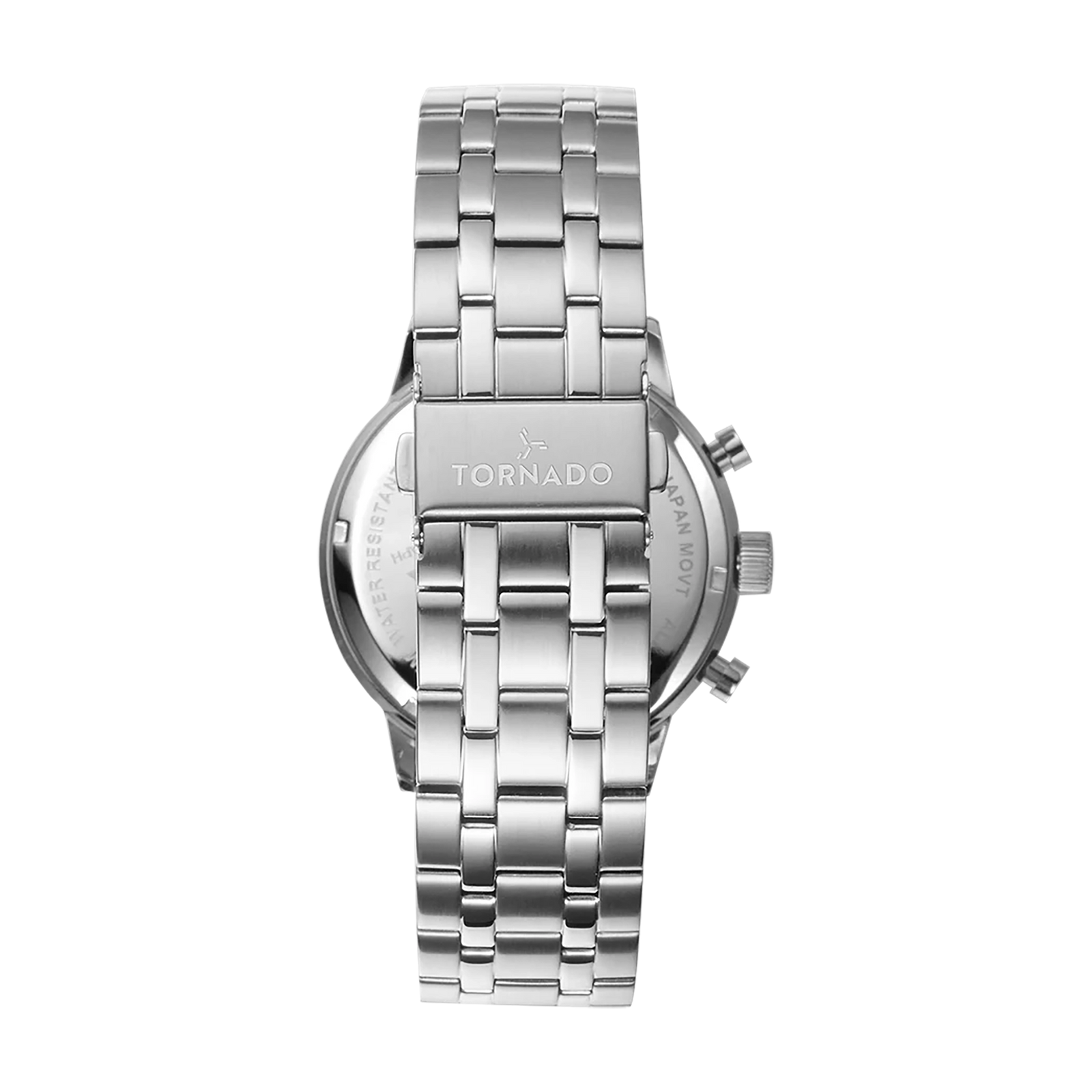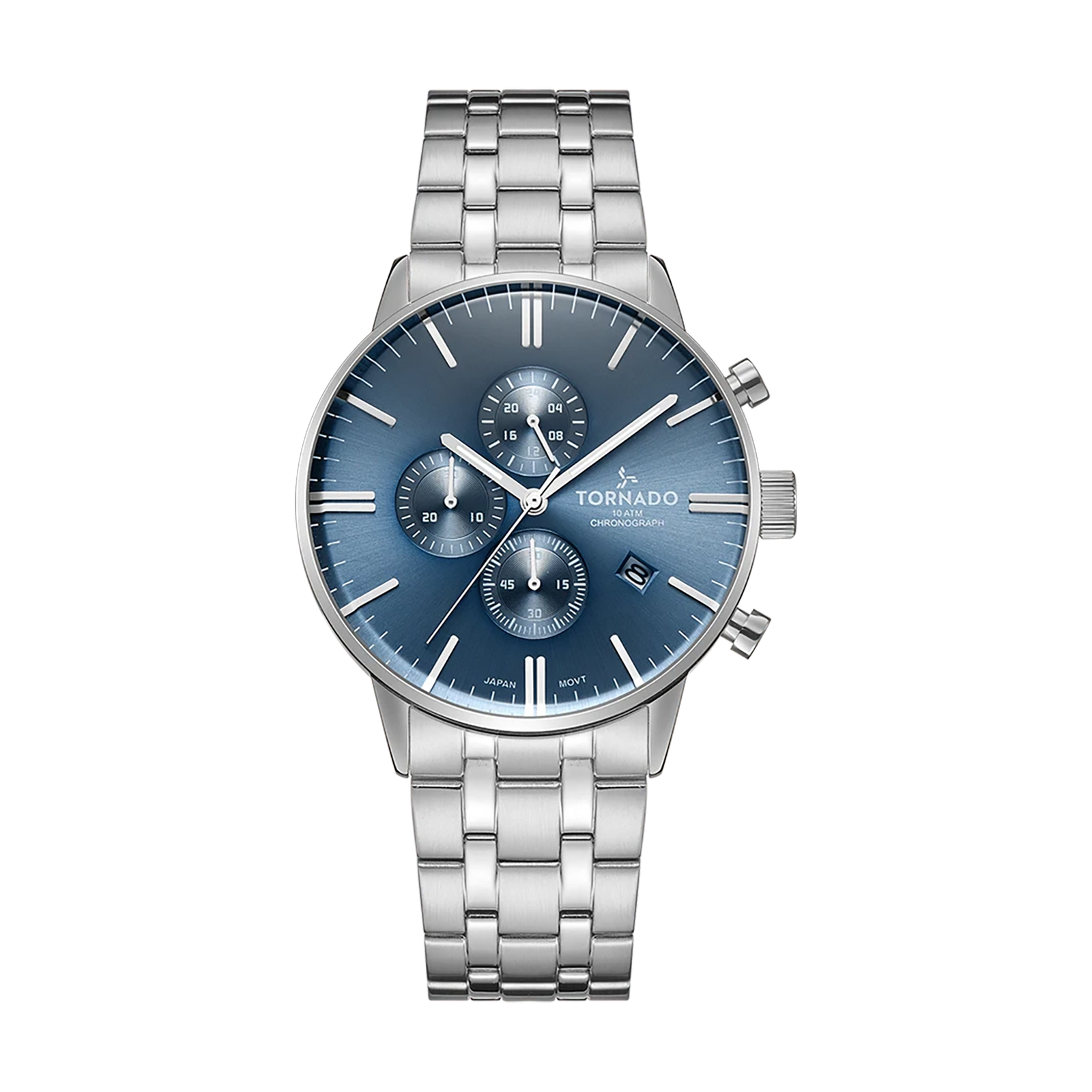 Tornado Celestia Elite Men's Chronograph Watch with blue dial, silver case and strap. Japan Quartz movement, sapphire coated glass, 10ATM water resistant. 3-year warranty included.