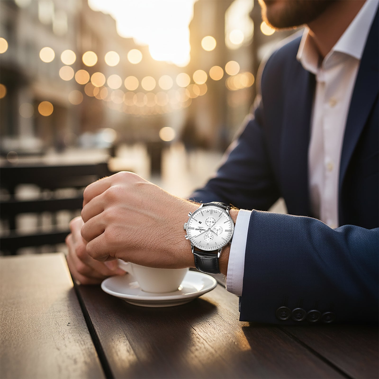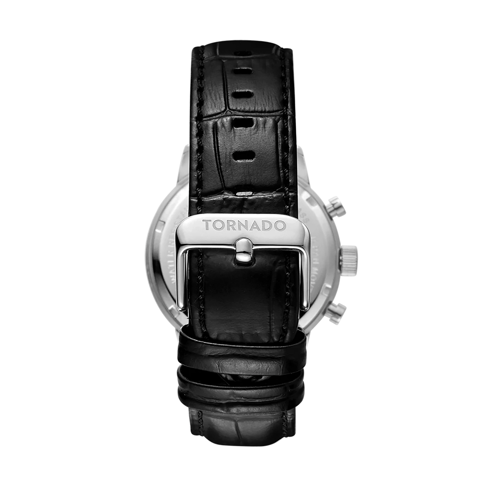 This version of the CELESTIA ELITE presents a very apparent classic appeal, pairing a silver stainless steel case with a white dial and a black leather strap. The 43 mm round case is crafted from 316L solid stainless steel and finished with a combination of brushed and polished surfaces, giving the watch a refined yet purposeful profile. A genuine leather strap with a crocodile pattern adds a traditional touch and secures comfortably with a tang buckle. Silver-toned luminous hands and hour markers on the white dial provide clear contrast and low-light legibility, while three chronograph subdials and a discreet date display are laid out to maintain a clean, symmetrical appearance. Sapphire-coated glass protects the dial, helping preserve its finish through daily use. Inside, the Miyota JS15 chronograph movement delivers dependable performance and precise timing functions. With a water resistance rating of 10 ATM, the Celestia Elite is suitable for everyday wear and light water exposure. The watch is backed by a three-year warranty, underscoring Tornado’s commitment to quality construction and long-term reliability.
