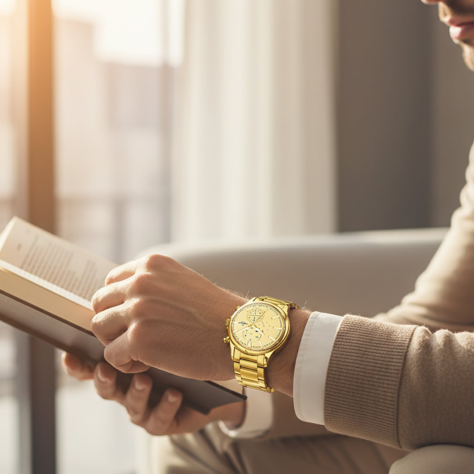 Tornado Celestia Elite Men's Multi Function Watch with beige dial, gold case and strap. Japan Quartz movement, mineral glass, 10ATM water resistant. 3-year warranty included.