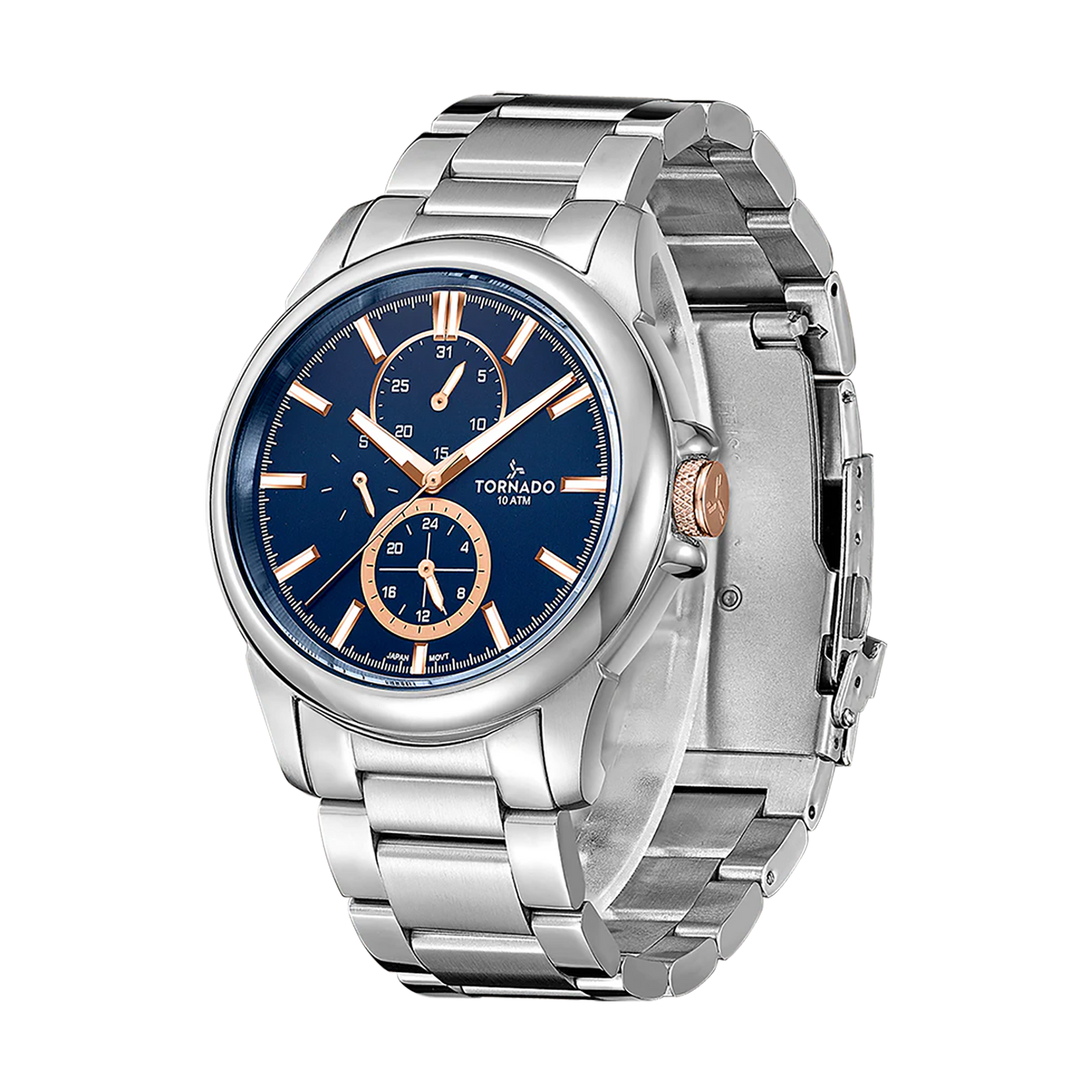 Tornado Celestia Elite Men's Multi Function Watch with blue dial, silver case and strap. Japan Quartz movement, mineral glass, 10ATM water resistant. 3-year warranty included.
