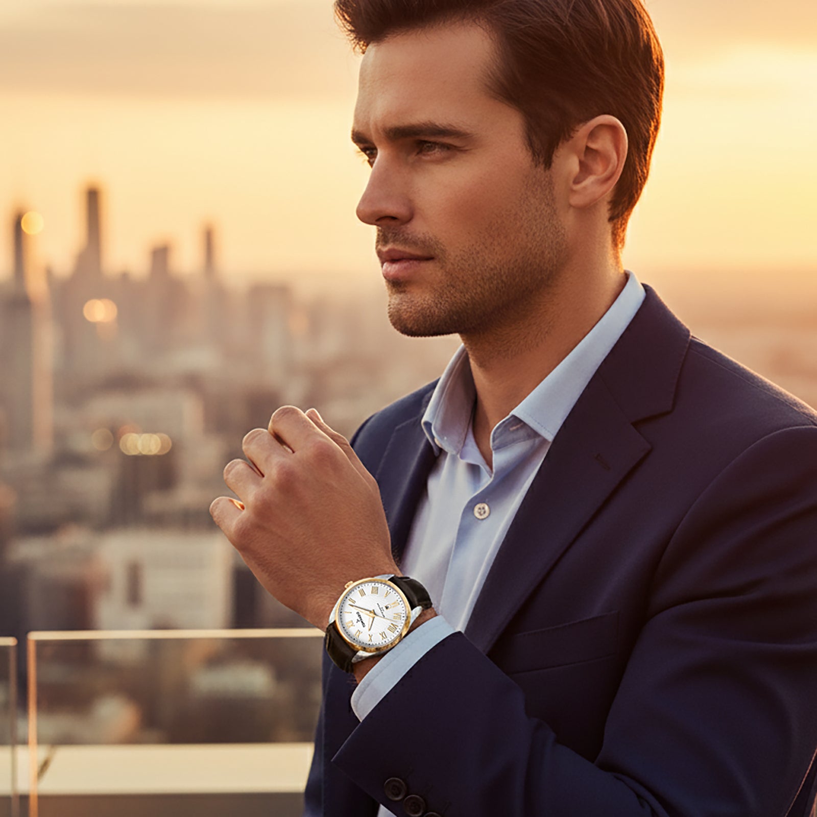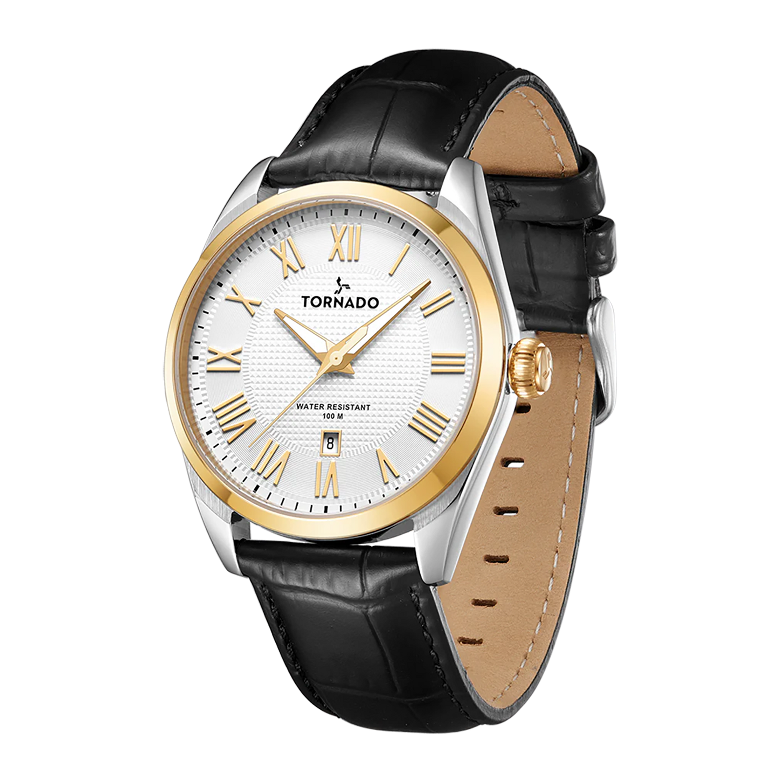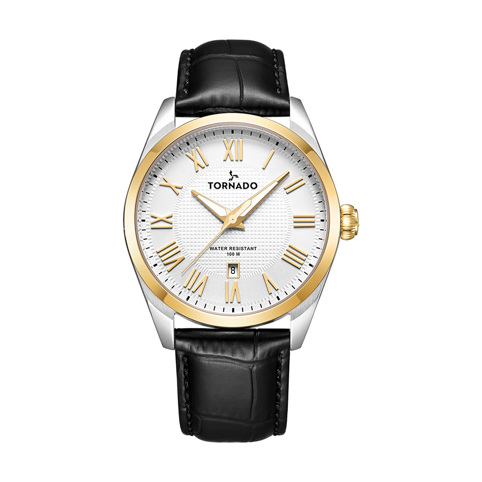 This rendition of the CELESTIA CLASSIC presents a clean, balanced traditional watch design. The 42 mm silver round case is formed from solid stainless steel and finished with a careful mix of brushed silver and polished gold tones, giving the watch visual depth while not making the build overzealous. Paired with a black genuine leather strap embossed with a crocodile pattern, the watch carries a formal tone without feeling rigid. The tang buckle keeps the fit straightforward and secure, reinforcing the model’s classic orientation. The white dial is a calm backdrop for the gold-toned hands and markers to stand out clearly at a glance. A discreet date display at six o’clock adds daily practicality while preserving the dial’s symmetry and restraint. Power comes from the Miyota 2115 quartz movement, chosen for its dependable accuracy and low-maintenance operation. Sapphire-coated glass protects the dial against scratches, and a water resistance rating of 10 ATM enables the piece for regular, active use. Supported by a three-year warranty, this Celestia Classic is well suited to those who prefer timeless simplicity and endurance over loud design trends.