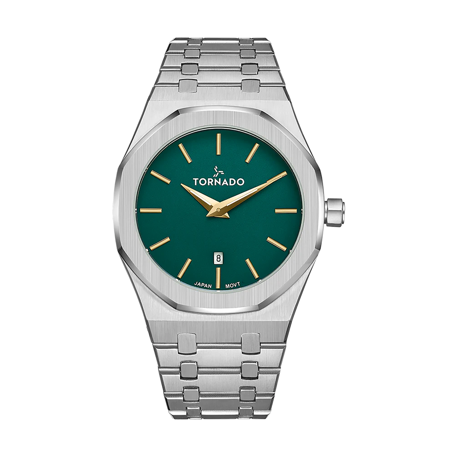 Elegant mens analog watch designed with a green dial and an octagonal stainless steel case finished with brushed and polished detailing. Comes with a stainless steel bracelet and double-pusher butterfly clasp for comfort and security. Driven by Miyota GM15 Japanese quartz movement, featuring sapphire-coated glass and 5 ATM water resistance, perfect for daily casual use.