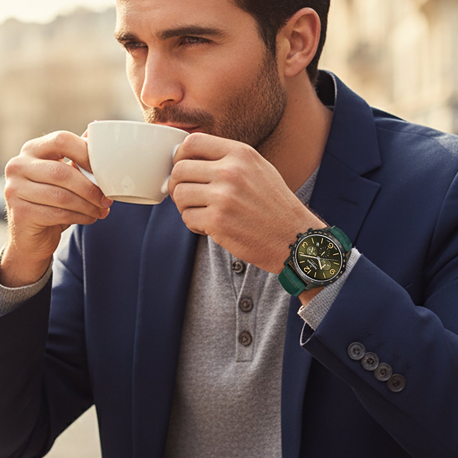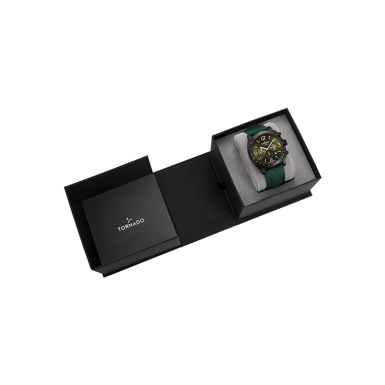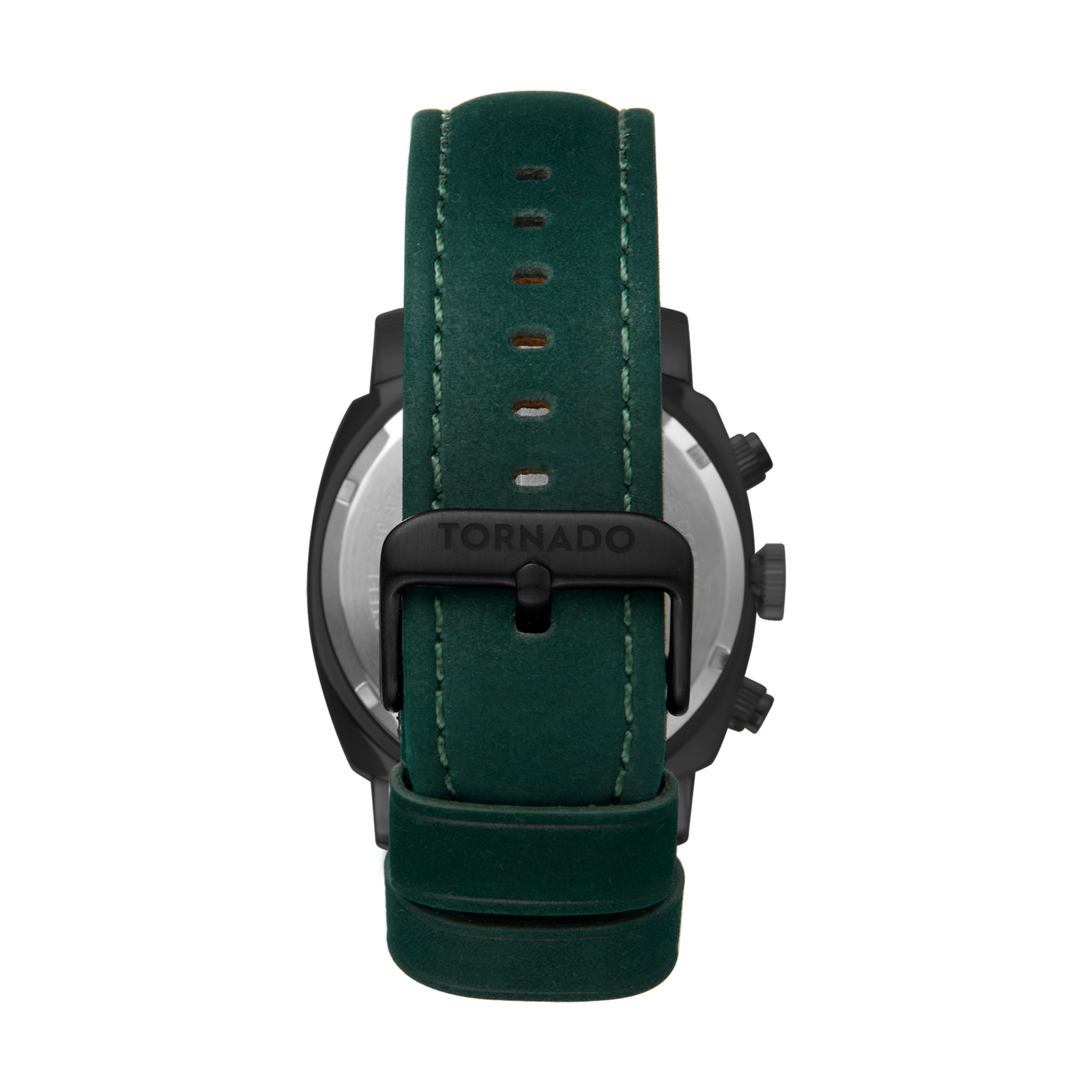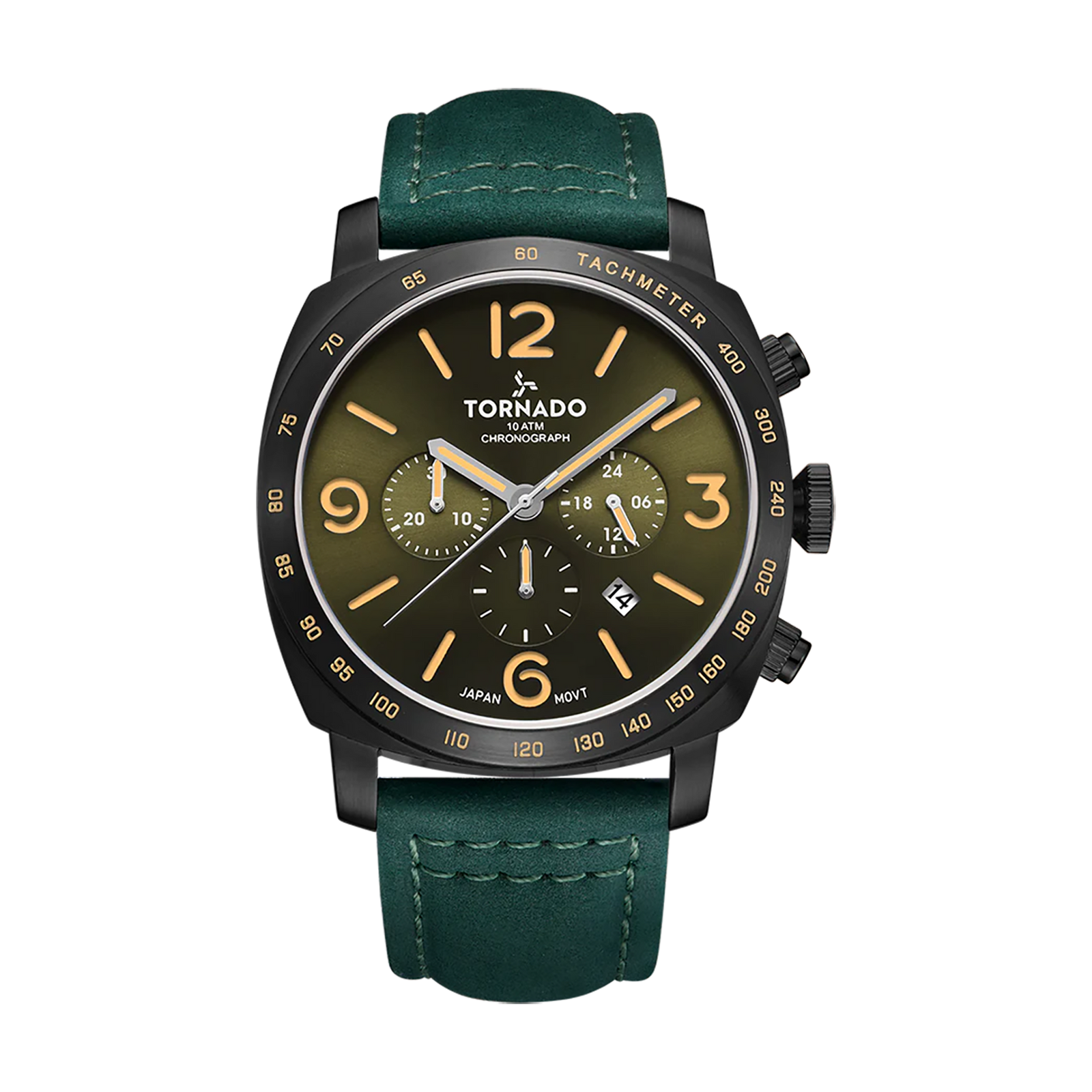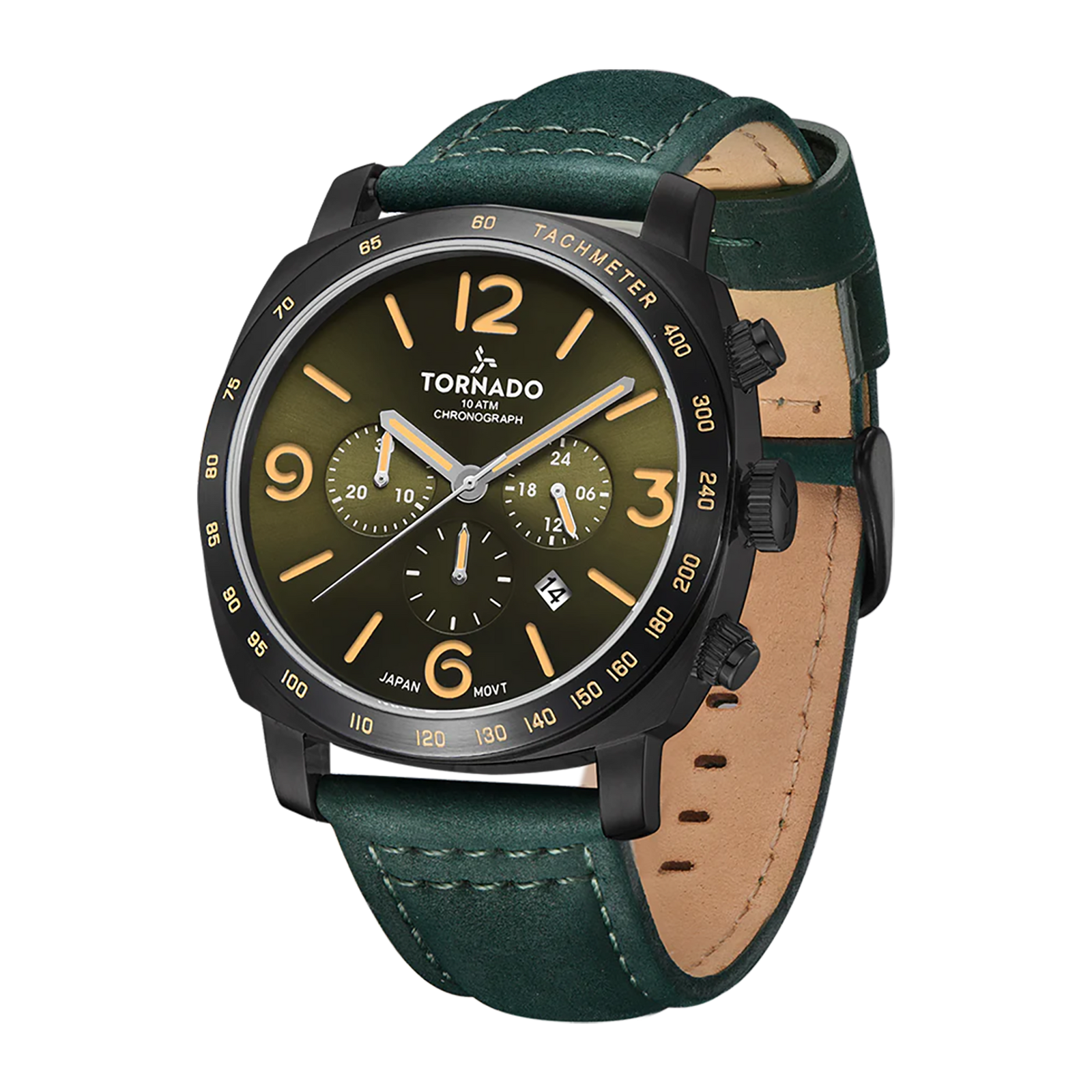 Tornado Lumina Chronosphere Men's Chronograph Watch with green dial, black case, green leather strap. Japan Quartz movement, sapphire coated glass, 10ATM water resistant. 3-year warranty included.